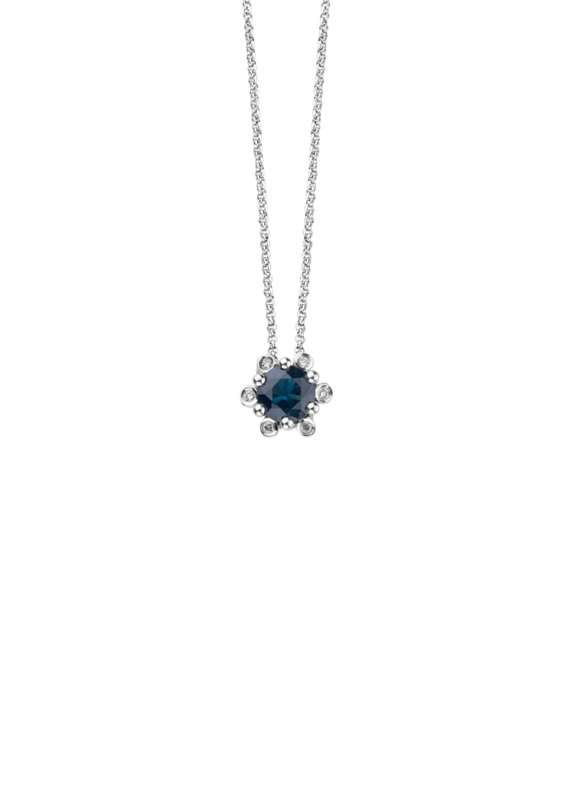 Deze hanger (exclusief collier) van Diamond Point is vervaardigd uit 14 karaat witgoud (0.7 gr.) en is gezet met een blauwe saffier en 6 briljant geslepen diamanten met een totaalgewicht van 0.03 ct. De hanger heeft een breedte van 6.5 mm.