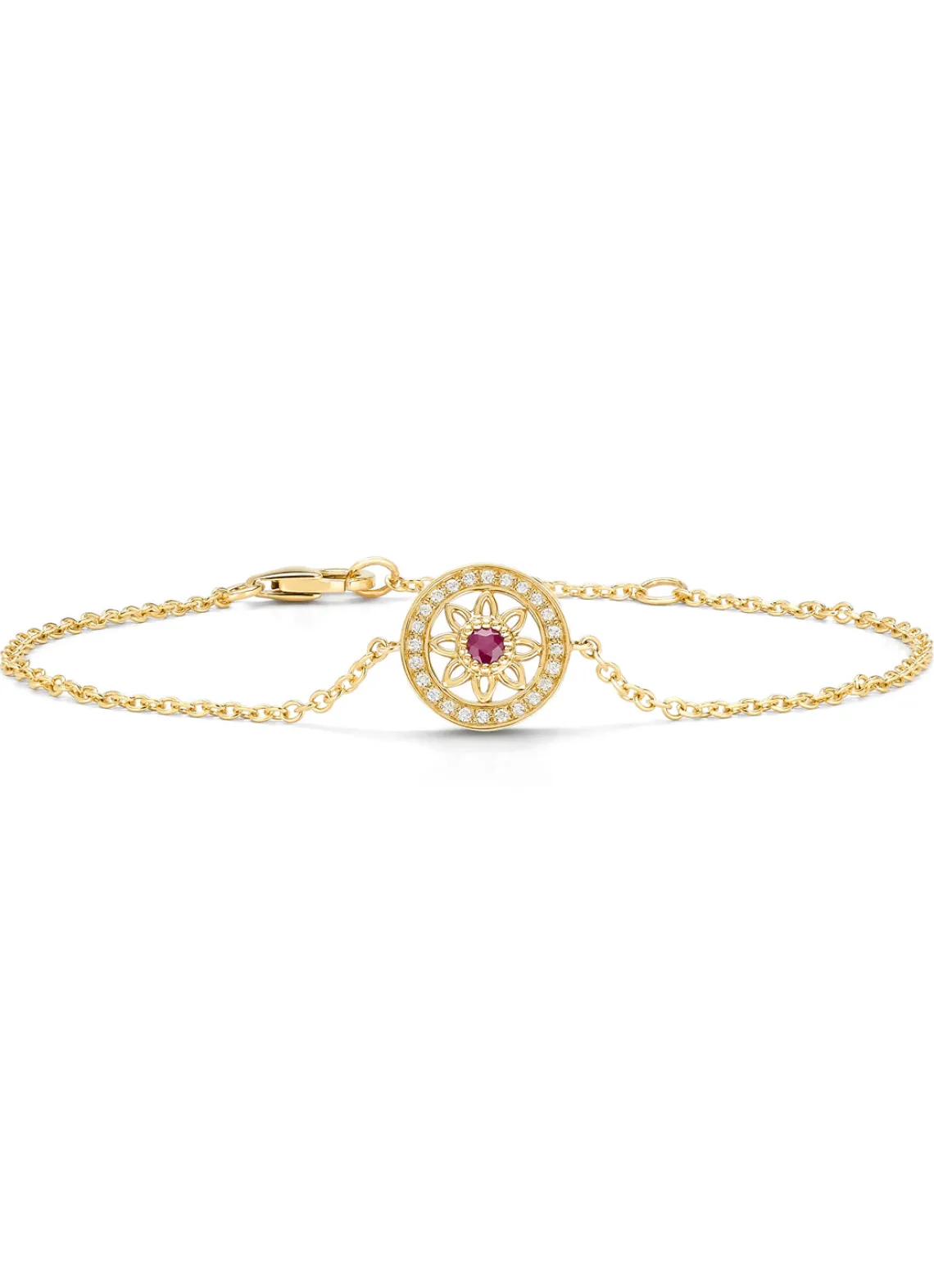 Deze armband bevat de geboortesteen van juli. De armband is vervaardigd uit 14 karaat geelgoud (2 gr.) en is gezet met een robijn en 24 briljant geslepen diamanten met een totaalgewicht van 0.07 ct. De armband heeft een minimale lengte van 16 cm., maximale lengte van 18 cm. en een breedte van 11 mm. De Birthstones sieraden zijn gezet met maandstenen met elk een bijzondere betekenis en kracht. Aan de robijn wordt een geneeskrachtige werking toebedeeld: de steen zou infecties helen, het immuunsysteem verbeteren en het bloed, het lichaam en de lymfeklieren reinigen.
