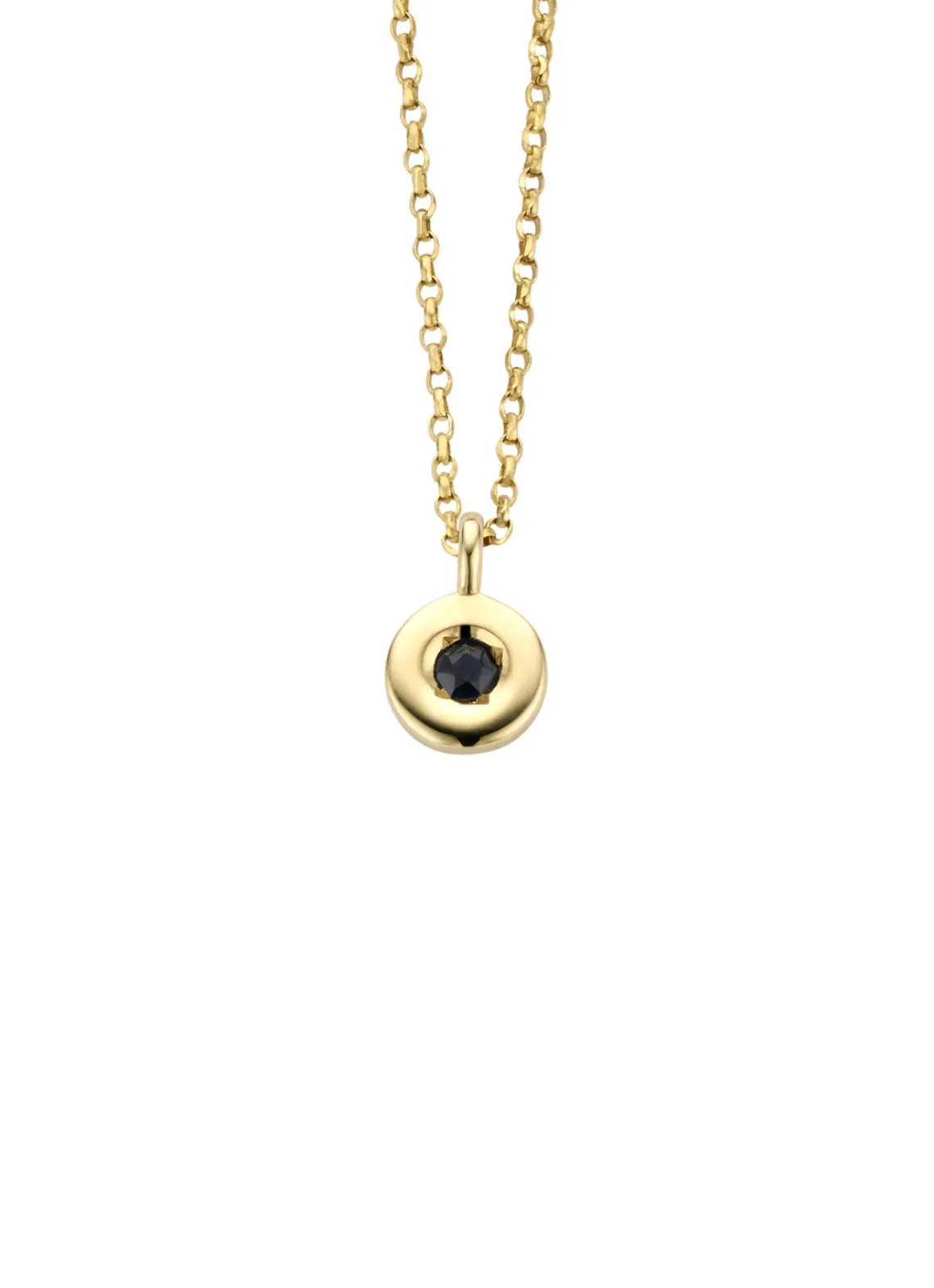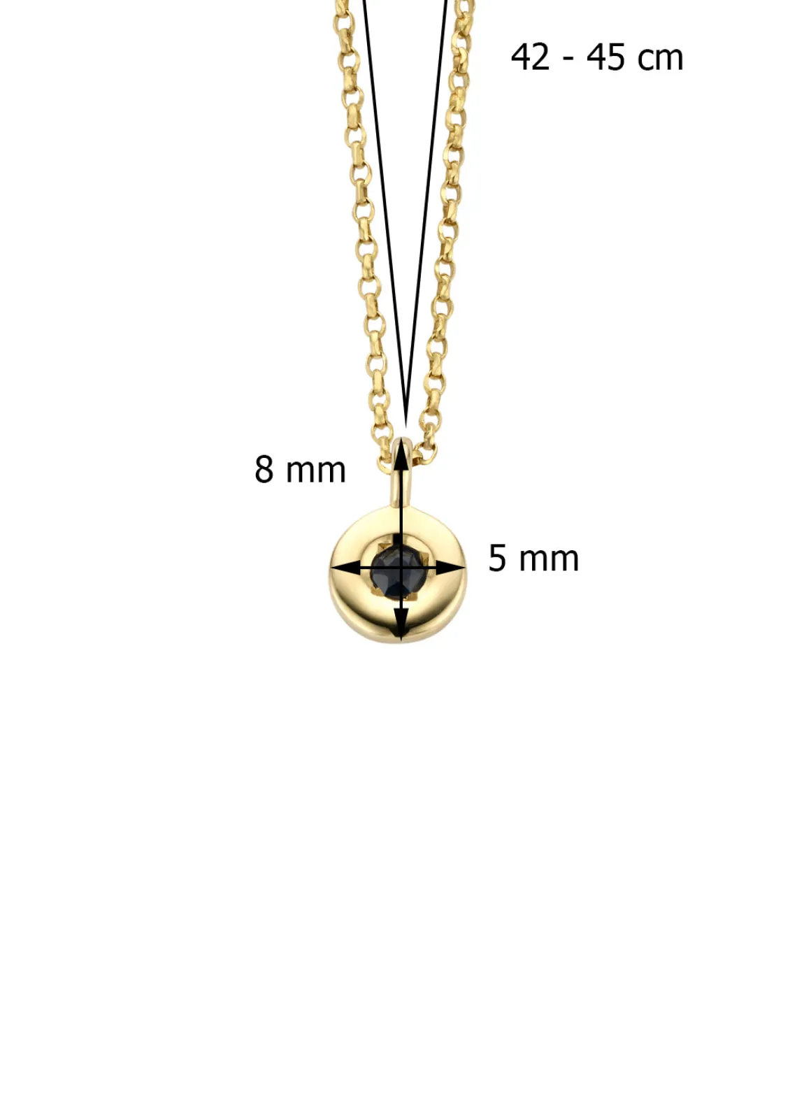 Deze saffier hanger is de geboortesteen van september. De hanger met collier zijn vervaardigd uit 14 karaat geelgoud en wegen samen ongeveer 1,6 gr. Elk collier is voorzien van een Diamond Point monogram tag. De hanger is 8 mm lang en 5 mm breed. Het collier is op 2 lengtes te dragen: 42 of 45 cm. De Birthstones sieraden zijn gezet met maandstenen met elk een bijzondere betekenis en kracht. De saffier staat voor waarheid, puurheid en oprechtheid.