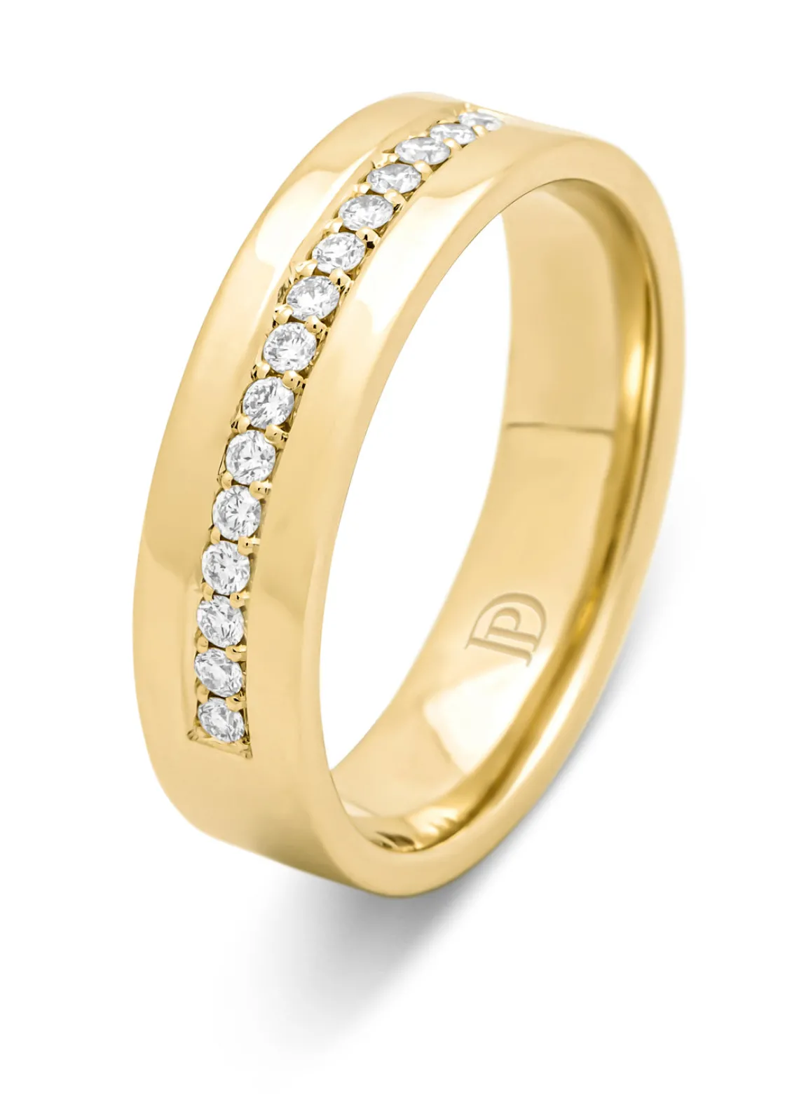 Deze trouwring van Diamond Point is vervaardigd uit 14 karaat geelgoud (5.7 gr.) en is gezet met 15 briljant geslepen diamanten met een totaalgewicht van 0.15 ct. De ring heeft een breedte van 5 mm. en een hoogte van 1.5 mm.