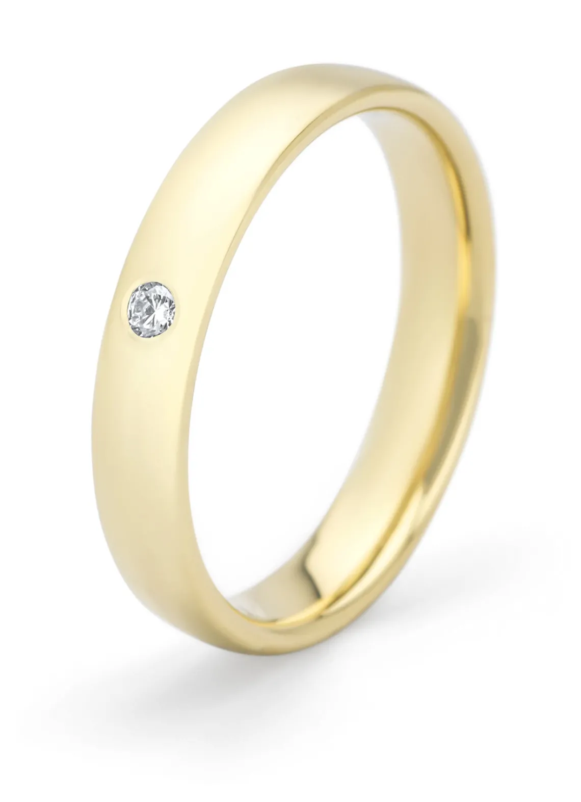 Deze trouwring van Diamond Point is vervaardigd uit 14 karaat geelgoud (3.8 gr.) en is gezet met een briljant geslepen diamant met een totaalgewicht van 0.03 ct. De diameter van de diamant is circa 2.0 mm. De ring heeft een breedte van 3.5 mm. en een hoogte van 1.5 mm.