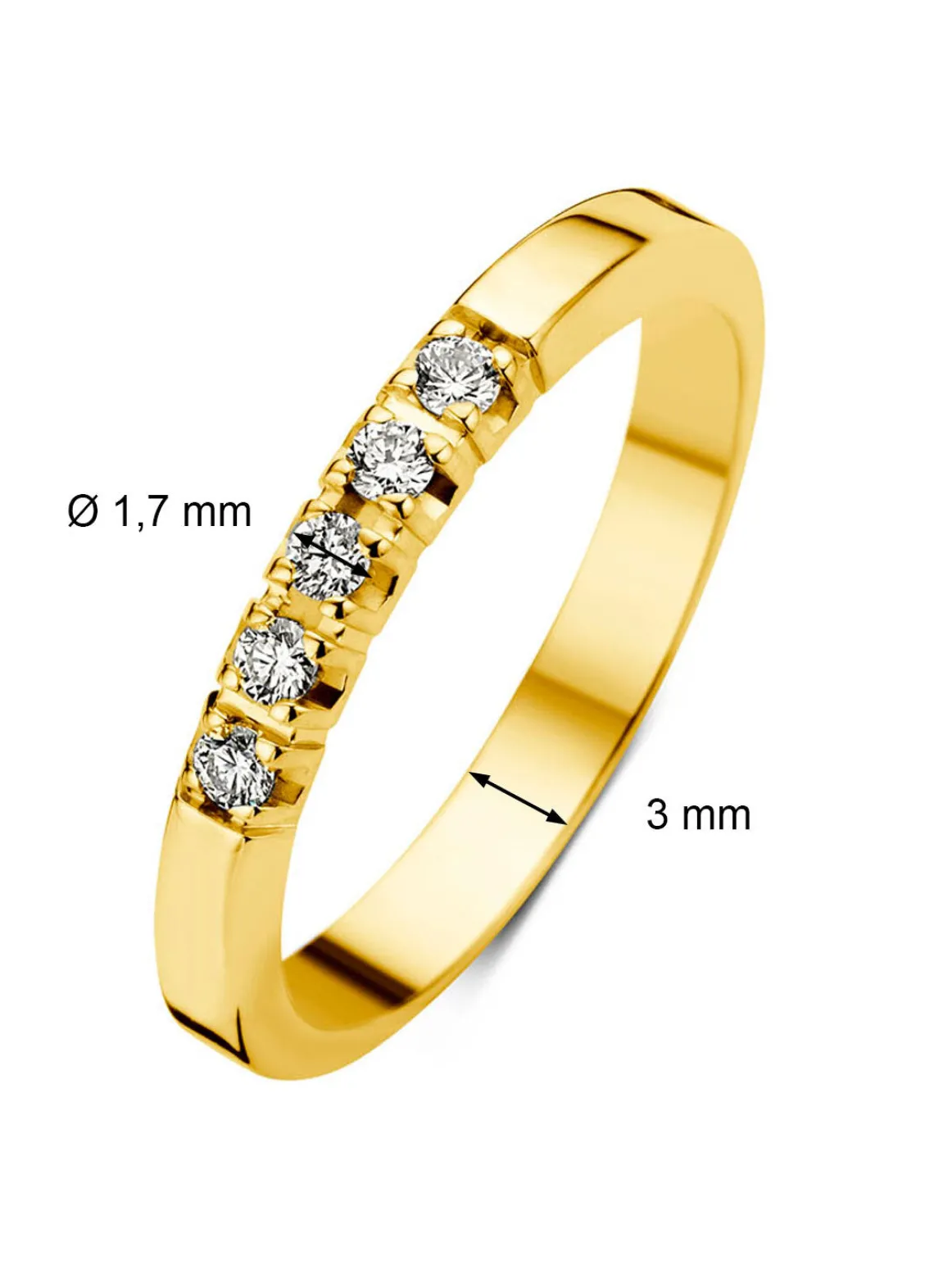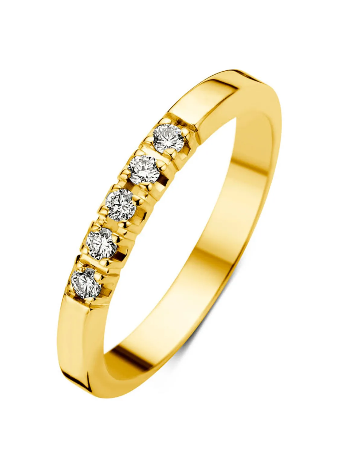 Deze alliance ring van Diamond Point is vervaardigd uit 18 karaat geelgoud (3.5 gr.) en is gezet met 5 briljant geslepen diamanten met een totaalgewicht van 0.1 ct.