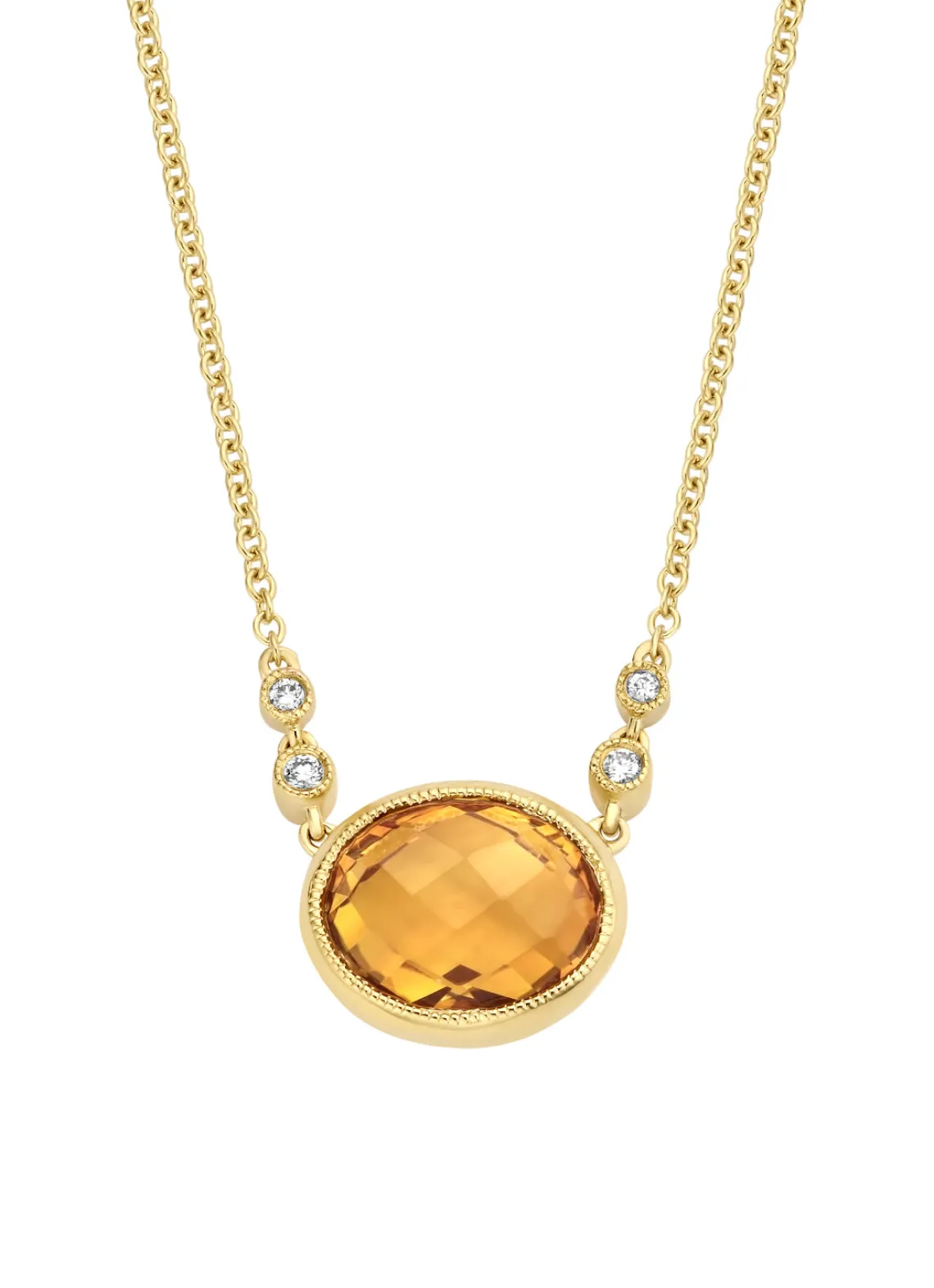 Dit collier van Diamond Point is vervaardigd uit 14 karaat geelgoud (2.8 gr.) en is gezet met citrien en briljant geslepen diamanten met een totaalgewicht van 0.03 ct. Het collier heeft een breedte van 10.5 mm., maximale lengte collier van 45 cm. en een minimale lengte collier van 42 cm.