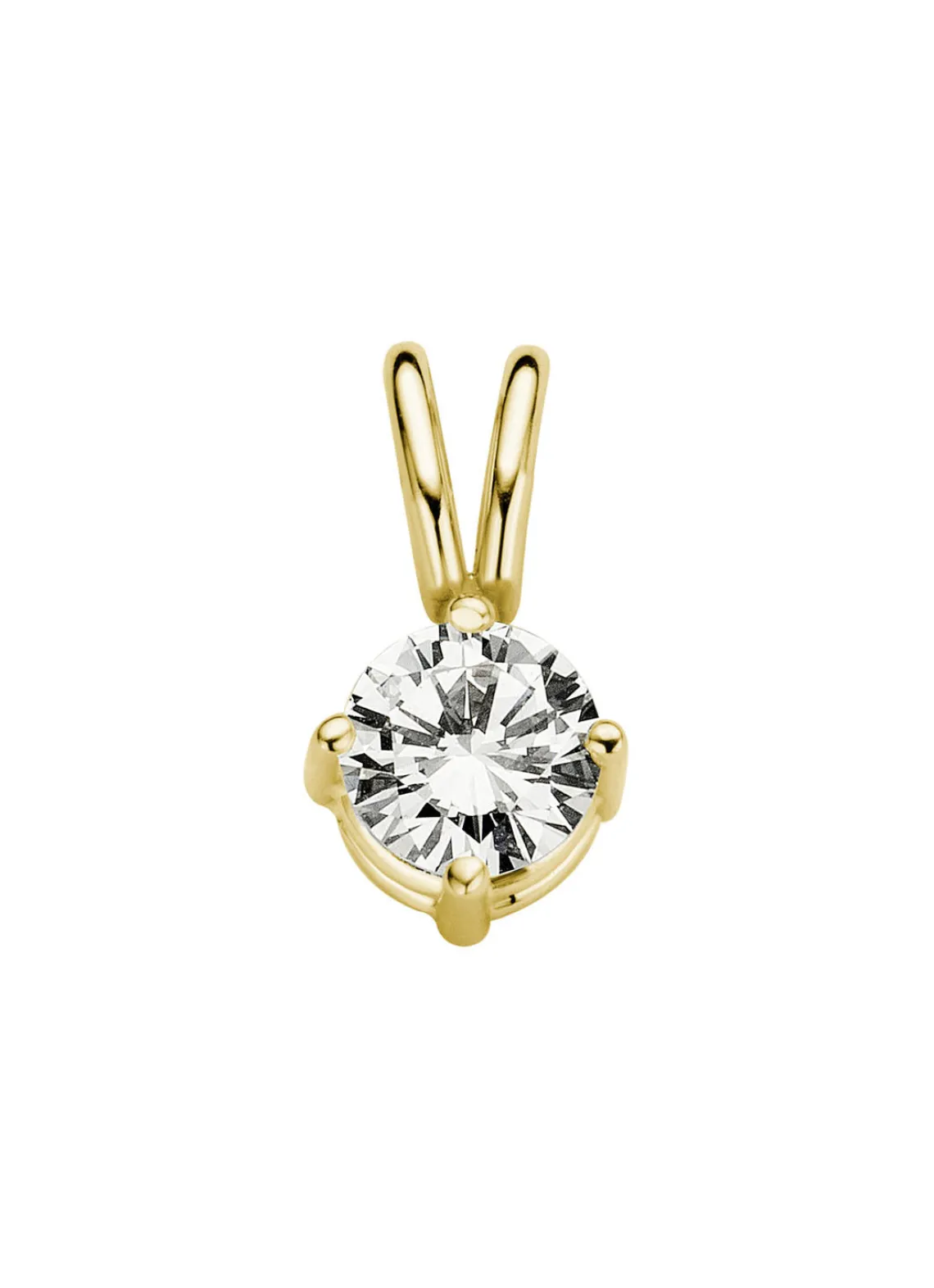 Deze hanger (exclusief collier) van Diamond Point is vervaardigd uit 18 karaat geelgoud (0.5 gr.) en is gezet met een briljant geslepen diamant met een totaalgewicht van 0.26 ct. De diameter van de diamant is circa 4.1 mm.