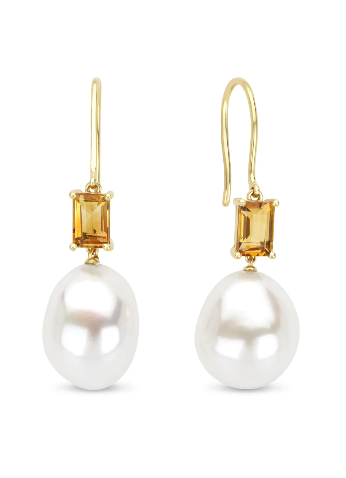 Deze parel oorsieraden van Diamond Point zijn vervaardigd uit 18 karaat geelgoud (1.4 gr.) en zijn gezet met barokparels met een diameter van circa 11-12 mm en 2 citrienen. De Oorsieraden hebben een lengte van 3.5 cm. en een breedte van 11 mm.