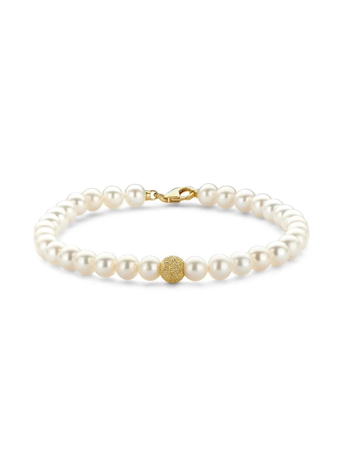 Deze armband van Diamond Point is voorzien van witte zoetwaterparels met een diameter van circa 5,5-6 mm. Het slot en het bolletje in het midden van de armband zijn vervaardigd uit 18 karaat geelgoud en wegen ongeveer 0,5 gram. De armband heeft een lengte van 19.5 cm en een breedte van 6 mm.