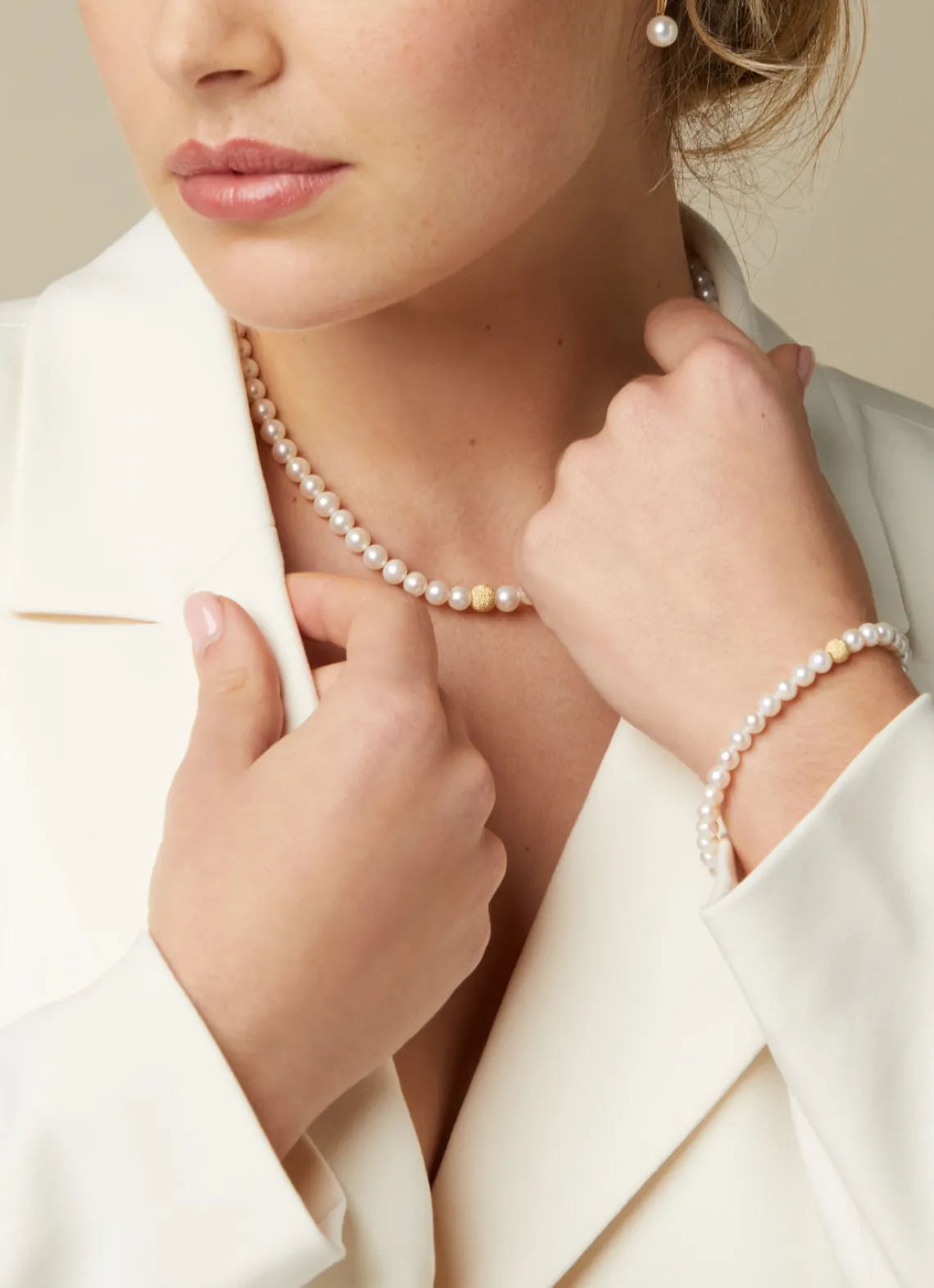 Even glooiend als de golven van de zee glijden de parels langs je halslijn en pols. De Franse rivièra roept. Je huid krijgt een extra glow door het weerkaatsend parelmoer van de glanzende zoetwaterparels. Roze kwarts, aquamarijn of gediamanteerd goud pronken naast de parels, geïnspireerd op de chique Franse kustplaatsen.