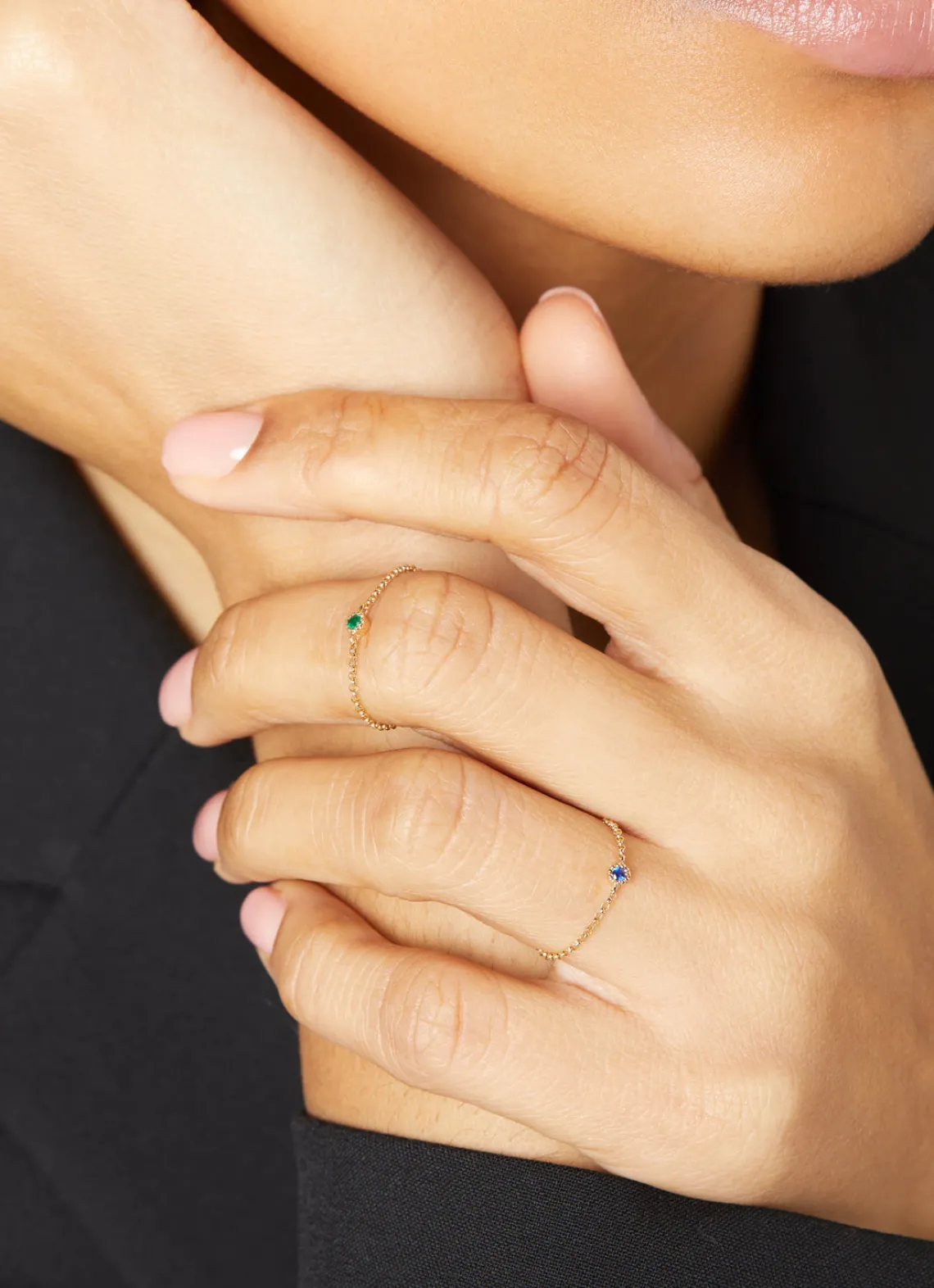 Deze ring chain van Diamond Point is vervaardigd uit 14 karaat geelgoud en is gezet met een smaragd. De ring heeft een breedte van 3 mm.