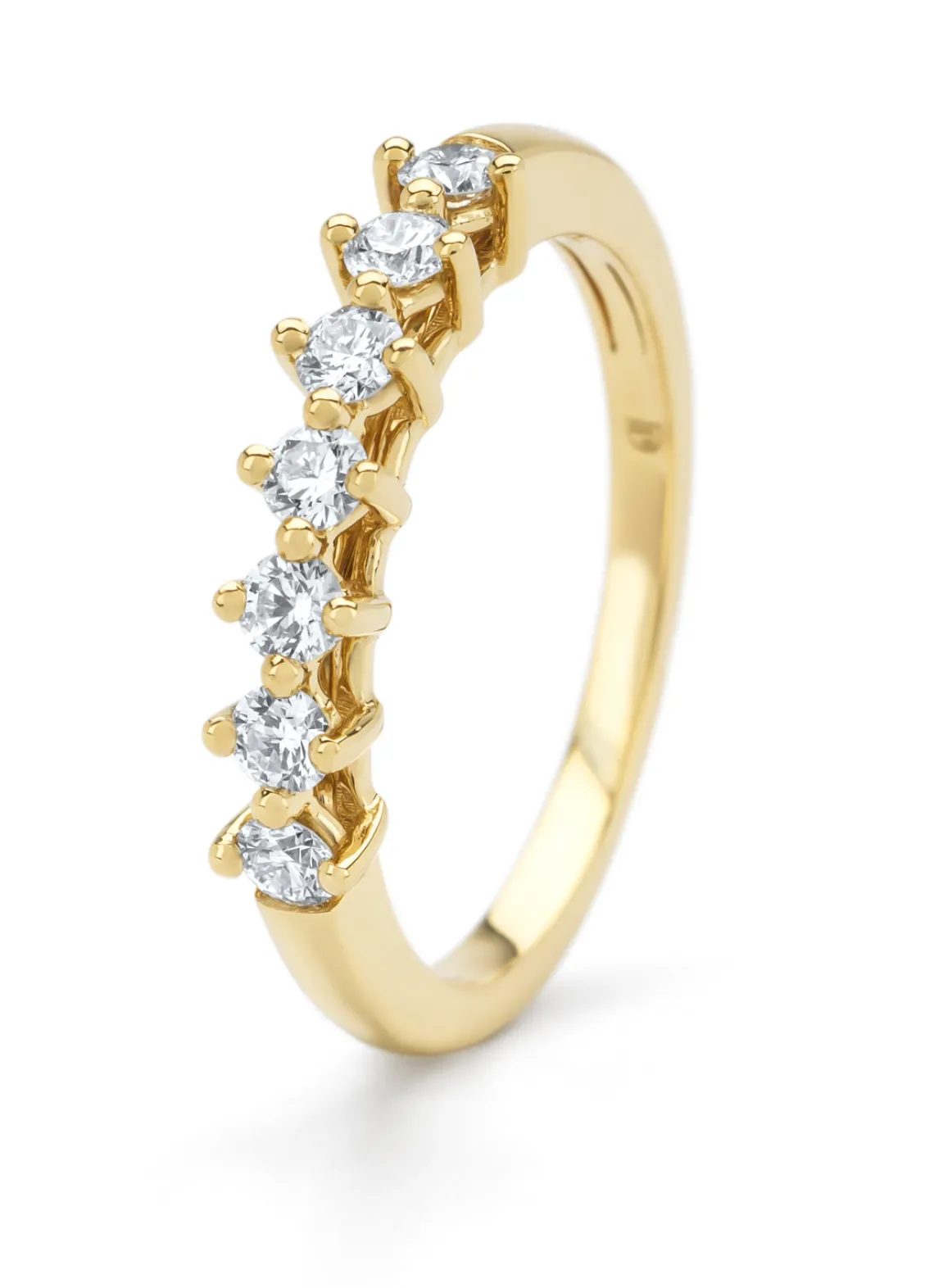 Deze alliance ring van Diamond Point is vervaardigd uit 18 karaat geelgoud (2.7 gr.) en is gezet met 7 briljant (hearts & arrows) geslepen diamanten met een totaalgewicht van 0.35 ct. De ring heeft een breedte van 4 mm.
