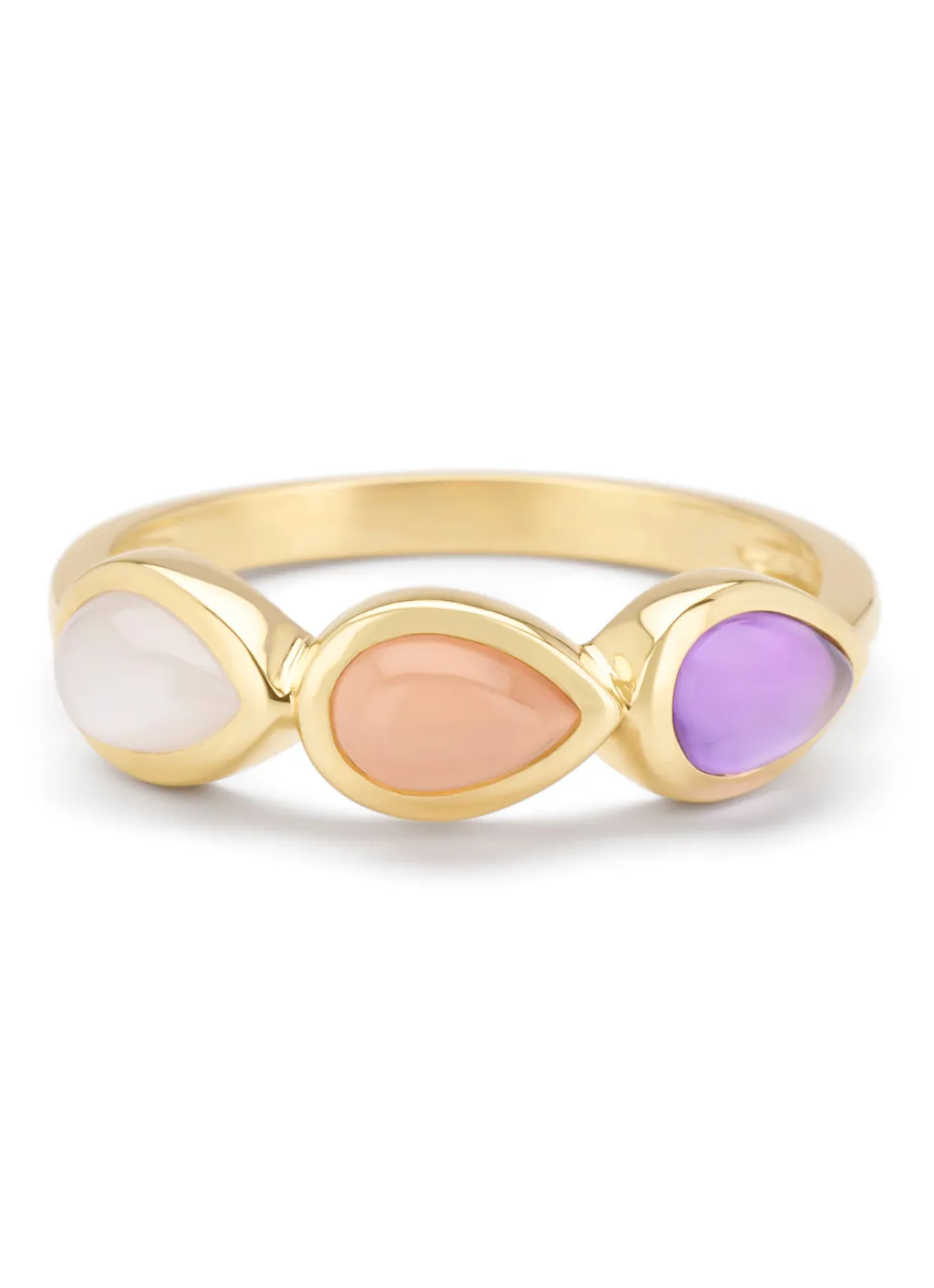 Deze ring gezet met kleurstenen van Diamond Point is vervaardigd uit 14 karaat geelgoud (2.4 gr.) en is gezet met kwarts, maansteen en paarse amethist. De ring heeft een minimale breedte van 2 mm., maximale breedte van 5.5 mm. en een hoogte van 3 mm.
