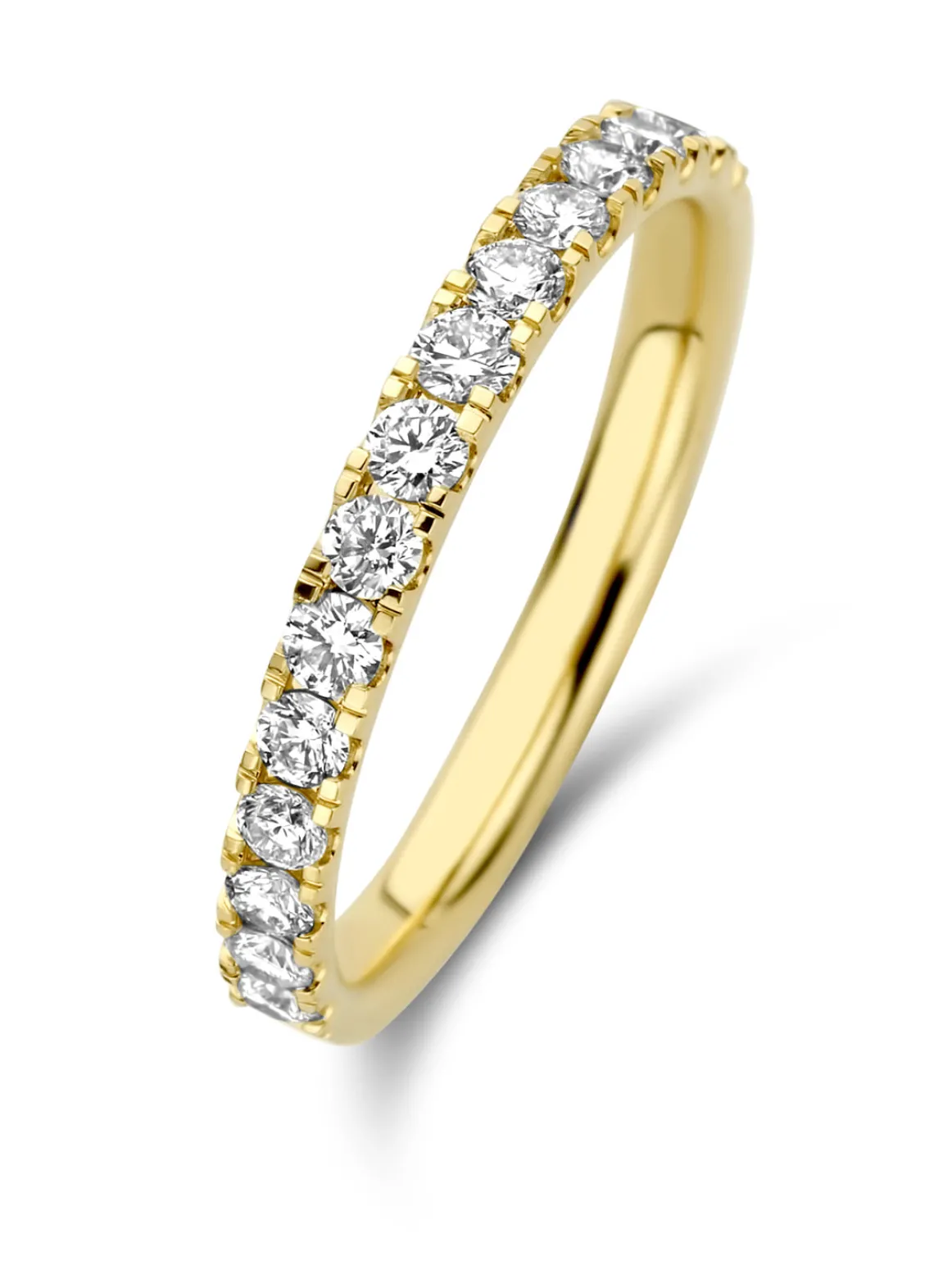 Deze trouwring van Diamond Point is vervaardigd uit 14 karaat geelgoud (2.7 gr.) en is gezet met 15 briljant geslepen diamanten met een totaalgewicht van 0.525 ct. De ring heeft een breedte van 2.3 mm.