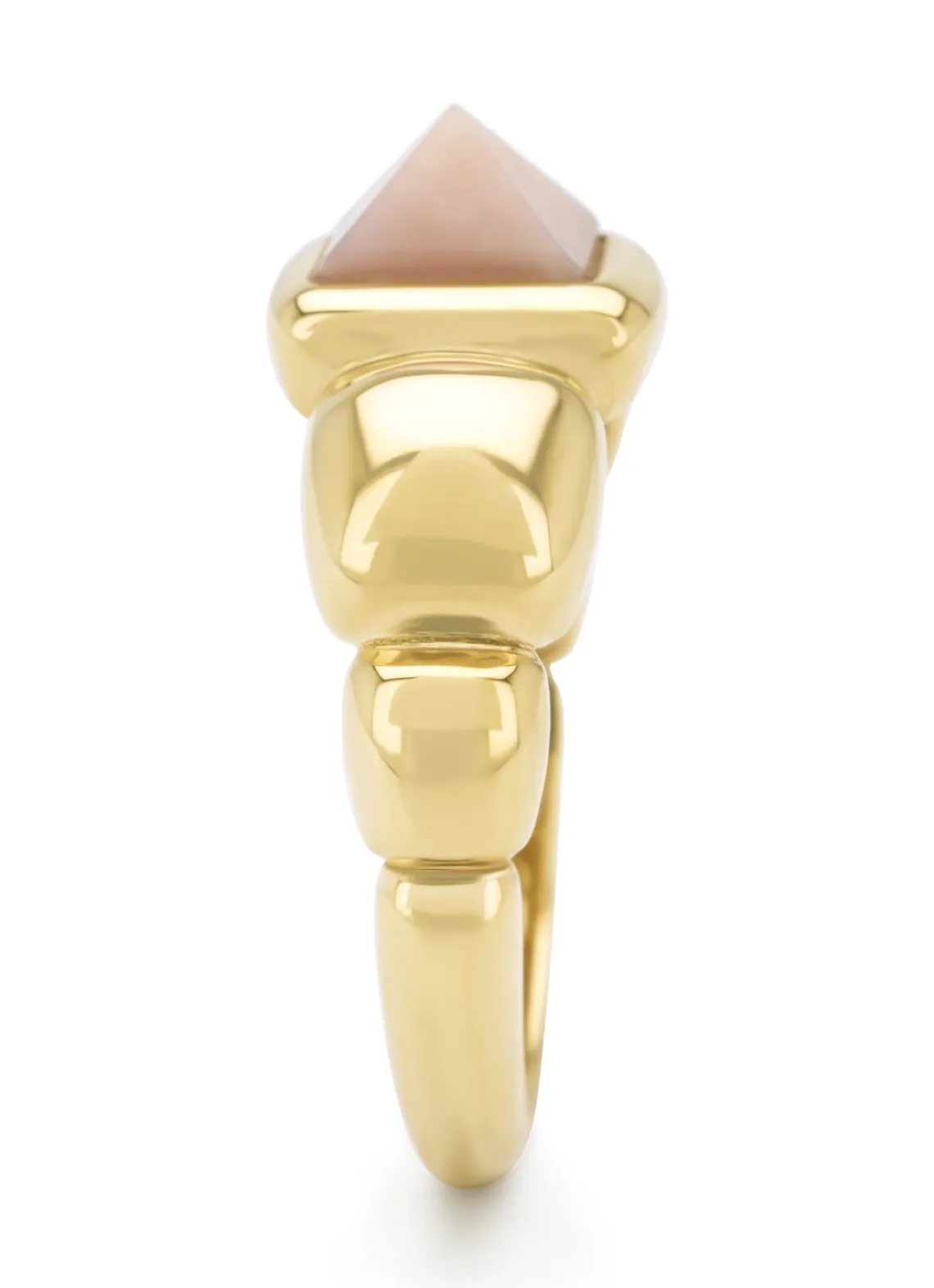 Deze ring gezet met kleurstenen van Diamond Point is vervaardigd uit 18 karaat geelgoud (5.3 gr.) en is gezet met een opaal. De ring heeft een minimale breedte van 3 mm., maximale breedte van 9 mm. en een hoogte van 6 mm.