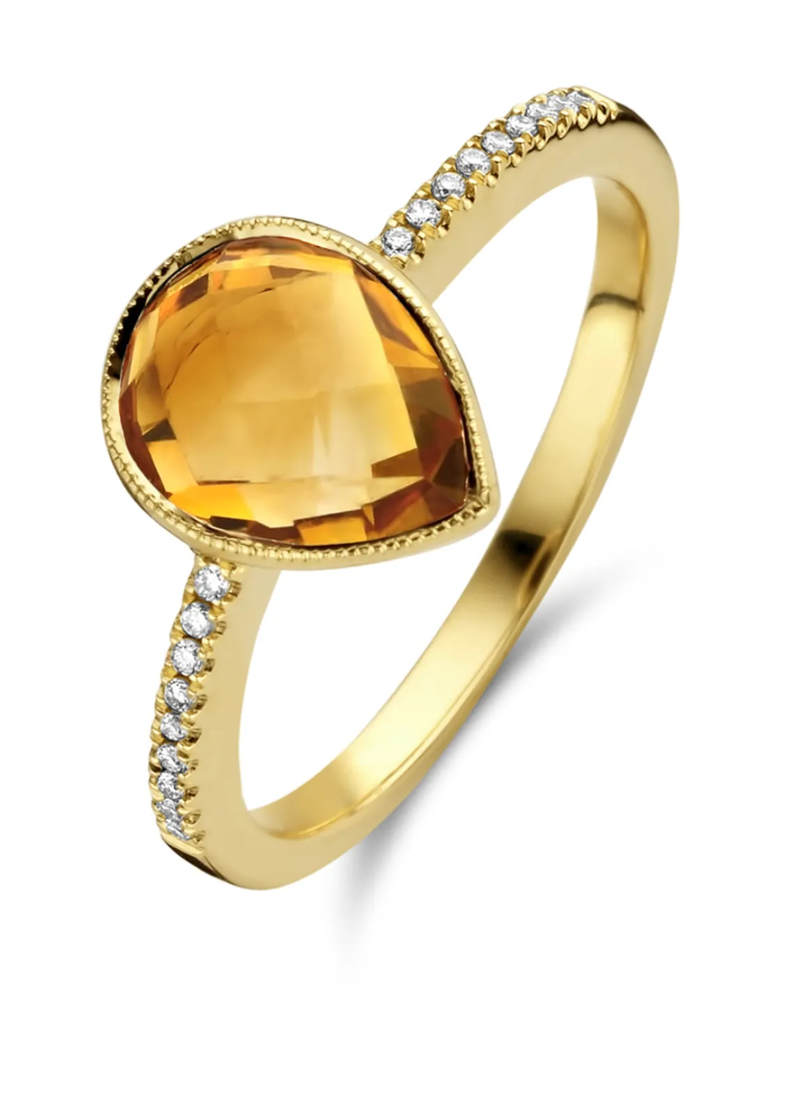Deze ring gezet met kleurstenen van Diamond Point is vervaardigd uit 14 karaat geelgoud (2.1 gr.) en is gezet met een oranje citrien en 18 briljant geslepen diamanten met een totaalgewicht van 0.05 ct. De ring heeft een minimale breedte van 1.5 mm., maximale breedte van 10 mm. en een hoogte van 4.5 mm.
