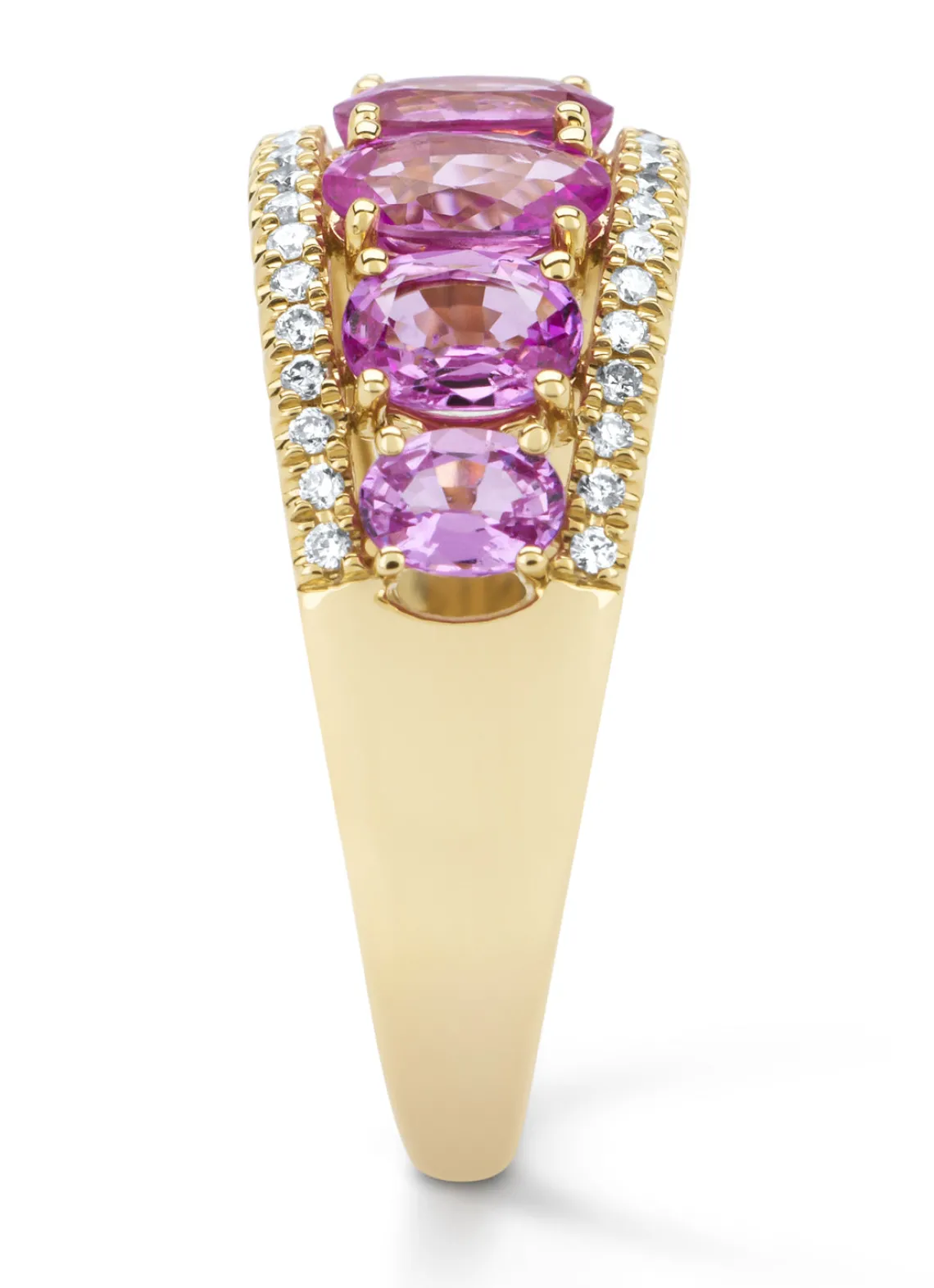 Deze ring gezet met kleurstenen van Diamond Point is vervaardigd uit 14 karaat geelgoud (3.9 gr.) en is gezet met roze saffieren en briljant geslepen diamanten met een totaalgewicht van 0.21 ct. De ring heeft een minimale breedte van 2.3 mm., maximale breedte van 9 mm. en een hoogte van 5 mm.