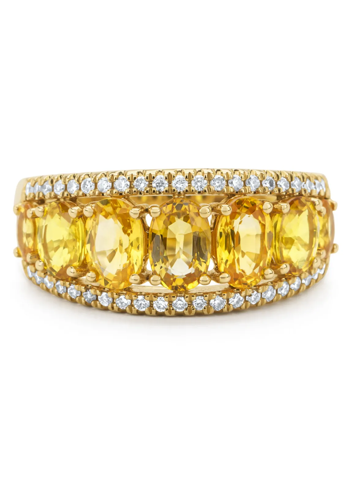 Deze ring gezet met kleurstenen van Diamond Point is vervaardigd uit 14 karaat geelgoud (4 gr.) en is gezet met gele saffieren en briljant geslepen diamanten met een totaalgewicht van 0.21 ct. De ring heeft een minimale breedte van 2.3 mm., maximale breedte van 9 mm. en een hoogte van 5 mm.