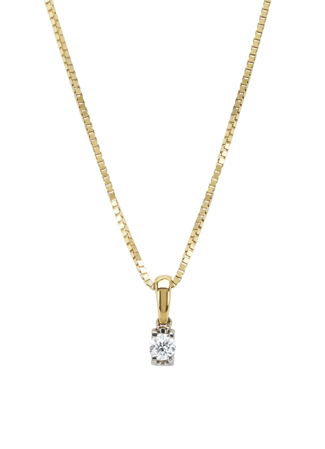 Deze hanger (exclusief collier) van Diamond Point is vervaardigd uit 18 karaat geel- en witgoud (0.4 gr.) en is gezet met een briljant geslepen diamant met een totaalgewicht van 0.11 ct. De diameter van de diamant is circa 3.0 mm.
