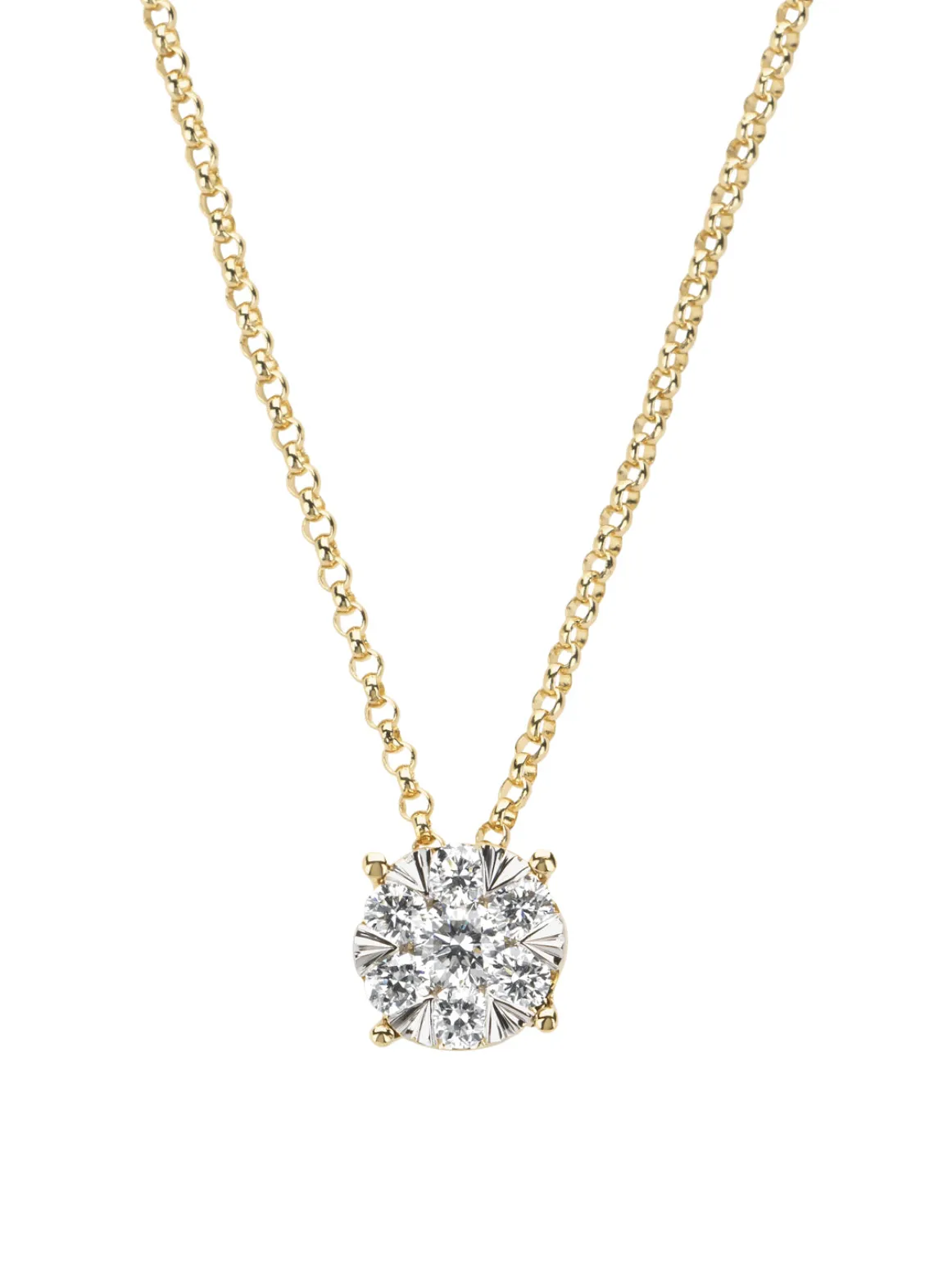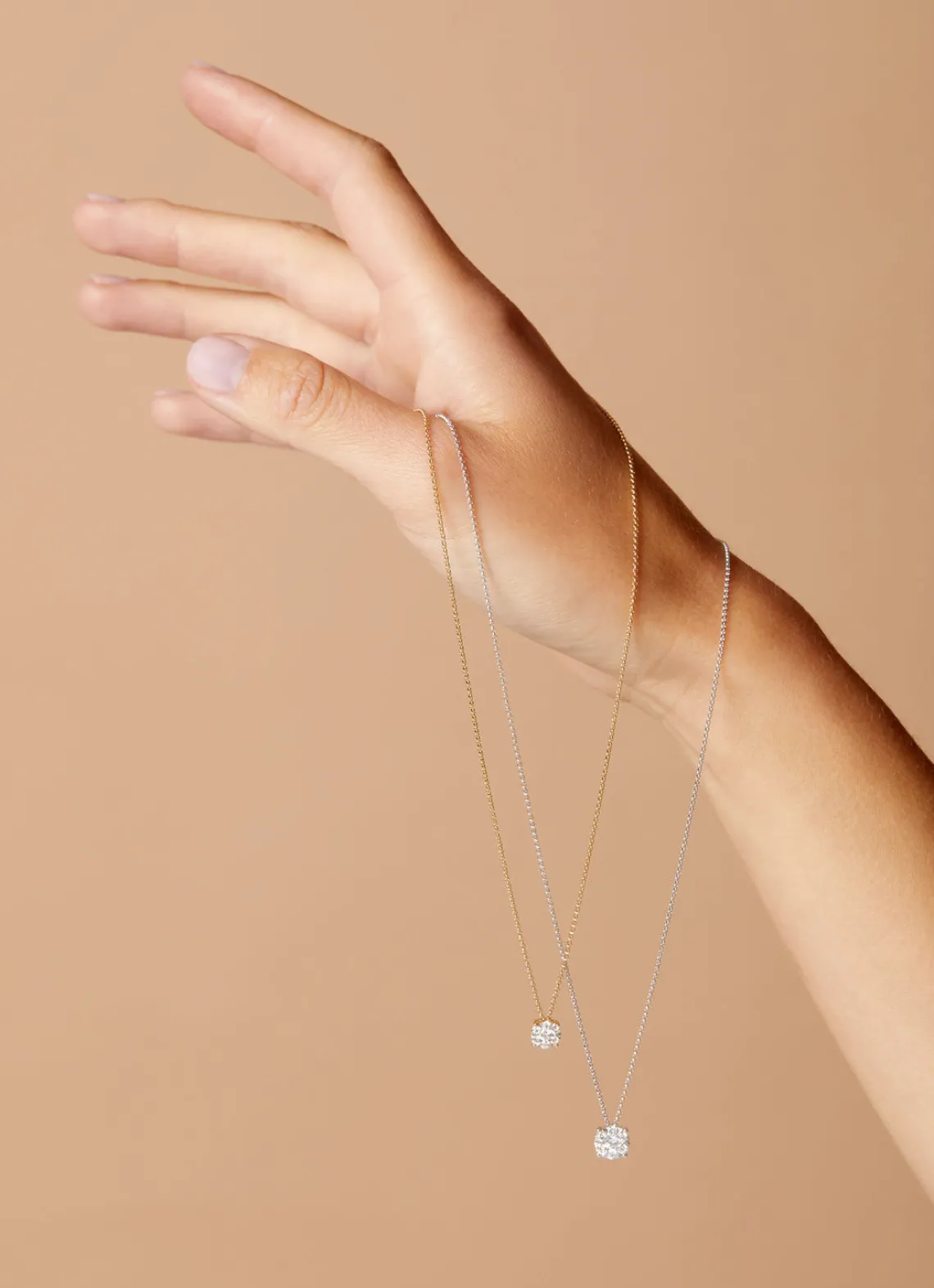 Laat u betoveren door meerdere diamanten in een bijzondere zetting, die samen één schitterend geheel vormen. Door een innovatieve zet-techniek van onze goudsmeden, worden diamanten in drie lagen gezet, waarbij twee lagen aan de binnenkant zijn gekanteld. Dit zorgt voor een optimale reflectie en creëert een verschijning van één enkele diamant met een groter formaat. De gelaagde zetting van de hanger heeft hierdoor een uitstraling van een 1.00ct diamant.