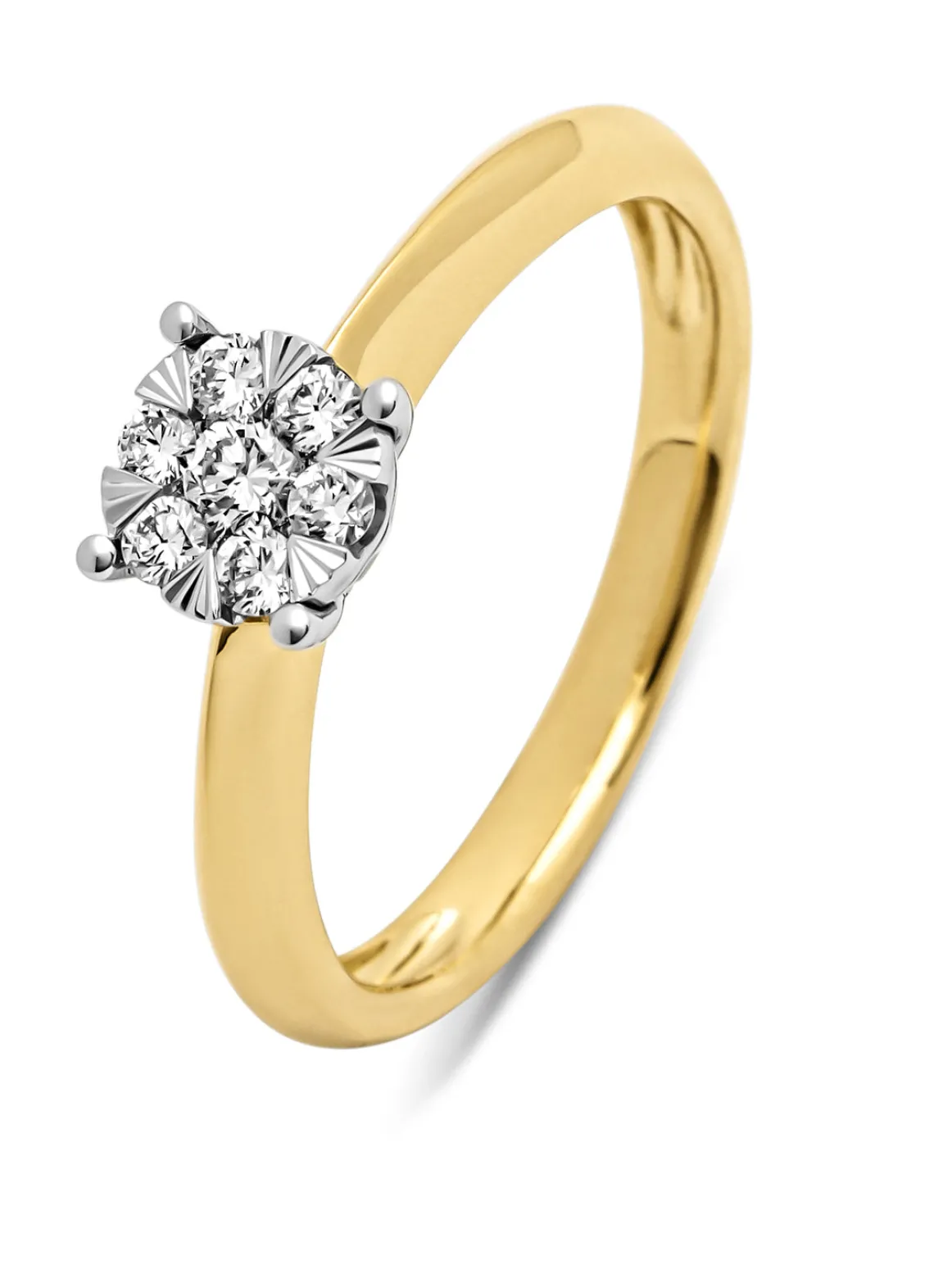 Laat u betoveren door meerdere diamanten in een bijzondere zetting, die samen één schitterend geheel vormen. Door een innovatieve zet-techniek van onze goudsmeden, worden diamanten in drie lagen gezet, waarbij twee lagen aan de binnenkant zijn gekanteld. Dit zorgt voor een optimale reflectie en creëert een verschijning van één enkele diamant met een groter formaat. De gelaagde zetting van de ring heeft hierdoor een uitstraling van een 0.75ct diamant.