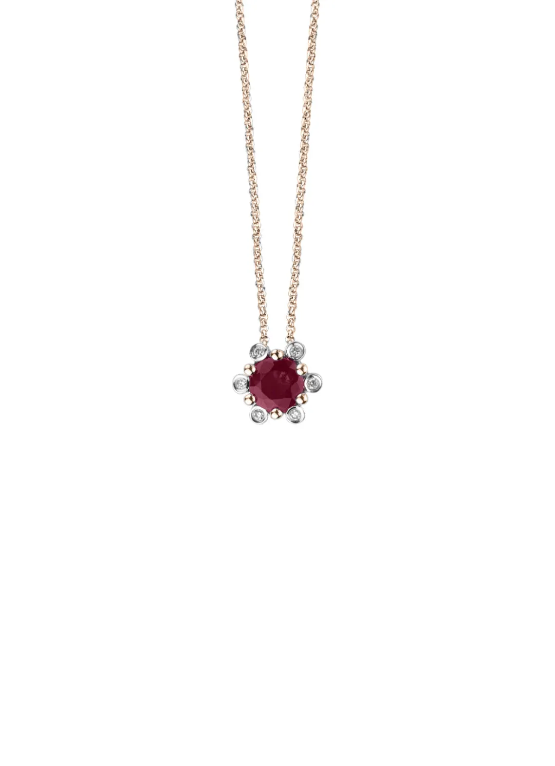 Deze hanger (exclusief collier) van Diamond Point is vervaardigd uit 14 karaat roségoud (0.6 gr.) en is gezet met een robijn en 6 briljant geslepen diamanten met een totaalgewicht van 0.03 ct. De hanger heeft een breedte van 6.5 mm.