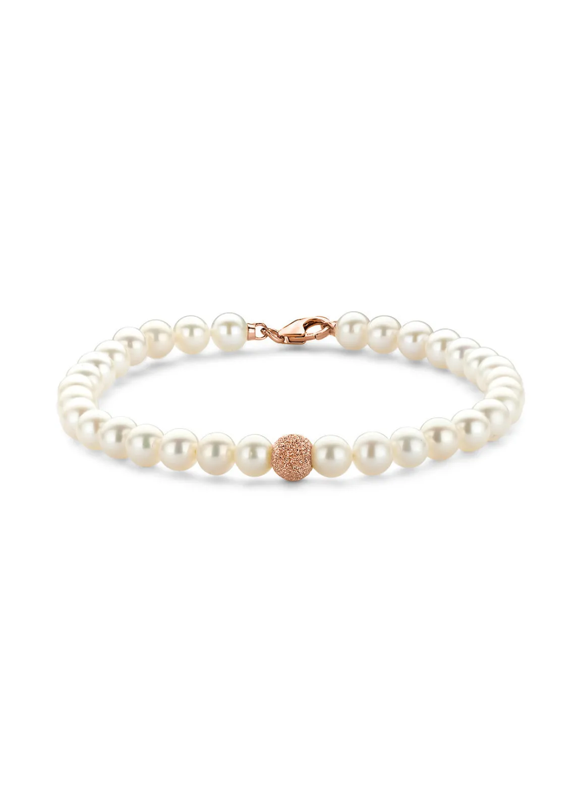 Deze armband van Diamond Point is voorzien van witte zoetwaterparels met een diameter van circa 5,5-6 mm. Het slot en het bolletje in het midden van de armband zijn vervaardigd uit 18 karaat roségoud en wegen ongeveer 0,5 gram. De armband heeft een lengte van 19.5 cm en een breedte van 6 mm.