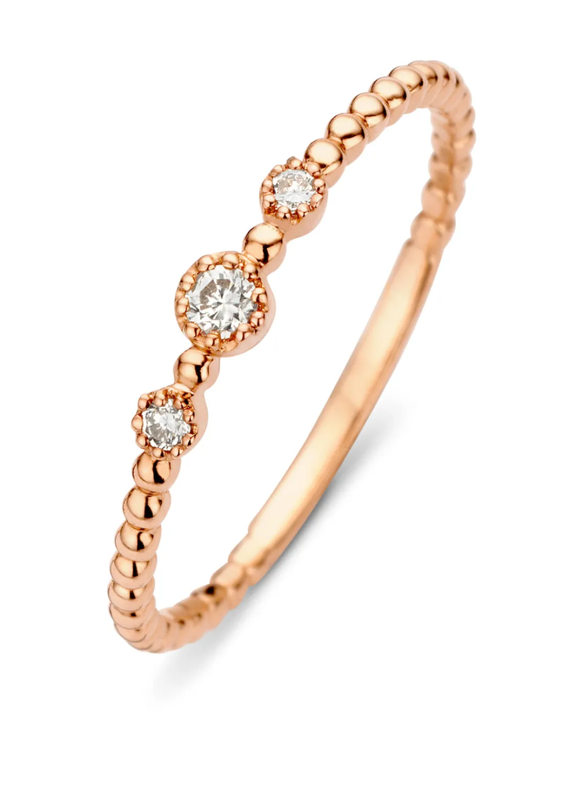 Deze ring van Diamond Point is vervaardigd uit 14 karaat roségoud (0.7 gr.) en is gezet met 3 briljant geslepen diamanten met een totaalgewicht van 0.07 ct. De ring heeft een minimale breedte van 1 mm. en een maximale breedte van 2.5 mm.