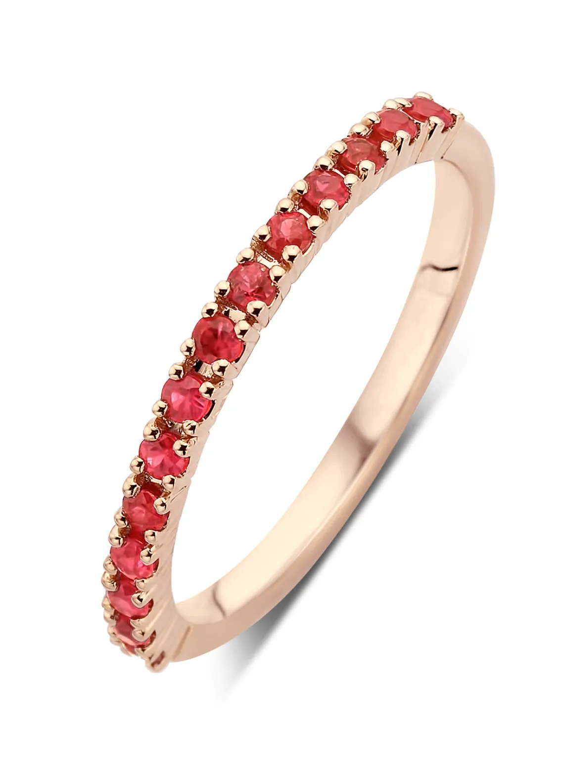 Deze ring gezet met kleurstenen van Diamond Point is vervaardigd uit 14 karaat roségoud (2 gr.) en is gezet met 13 robijnen. De ring heeft een breedte van 2 mm. en een hoogte van 2.3 mm.