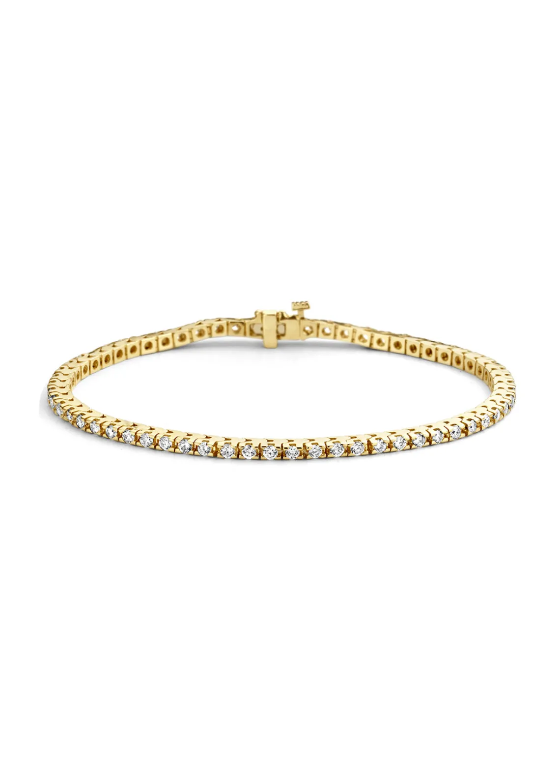 Deze klassieke tennisarmband met in totaal 2.00 ct briljant geslepen diamanten is vervaardigd uit 14 krt geelgoud, zit prachtig om de pols (kantelt niet!) en is voorzien van een extra veiligheidssluiting. De armband heeft een lengte van 18 cm, een breedte van 2 mm en een hoogte van 3 mm.