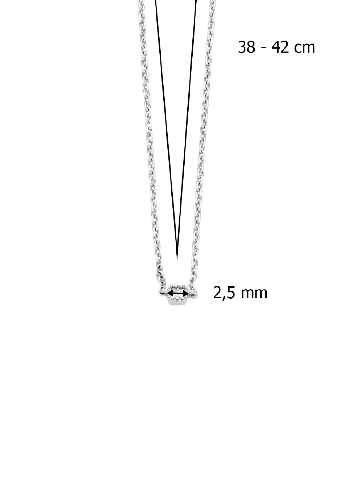 Dit collier van Diamond Point is vervaardigd uit 14 karaat witgoud (1.48 gr.) en is gezet met een princess geslepen diamant met een totaalgewicht van 0.04 ct. Het collier heeft een breedte van 2.5 mm., maximale lengte collier van 42 cm. en een minimale lengte collier van 38 cm.