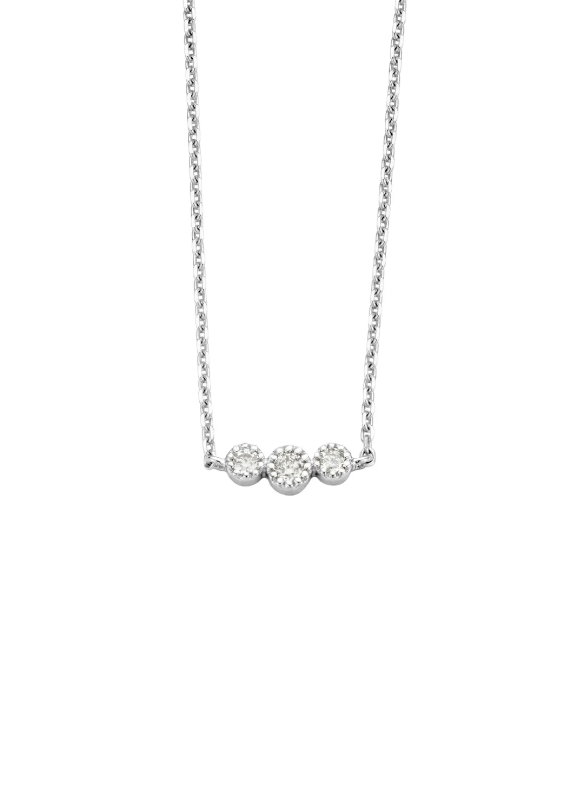 Dit collier van Diamond Point is vervaardigd uit 14 karaat witgoud (1.96 gr.) en is gezet met 3 briljant geslepen diamanten met een totaalgewicht van 0.11 ct. Het collier heeft een lengte van 8 mm., maximale lengte collier van 42 cm. en een minimale lengte collier van 38 cm.