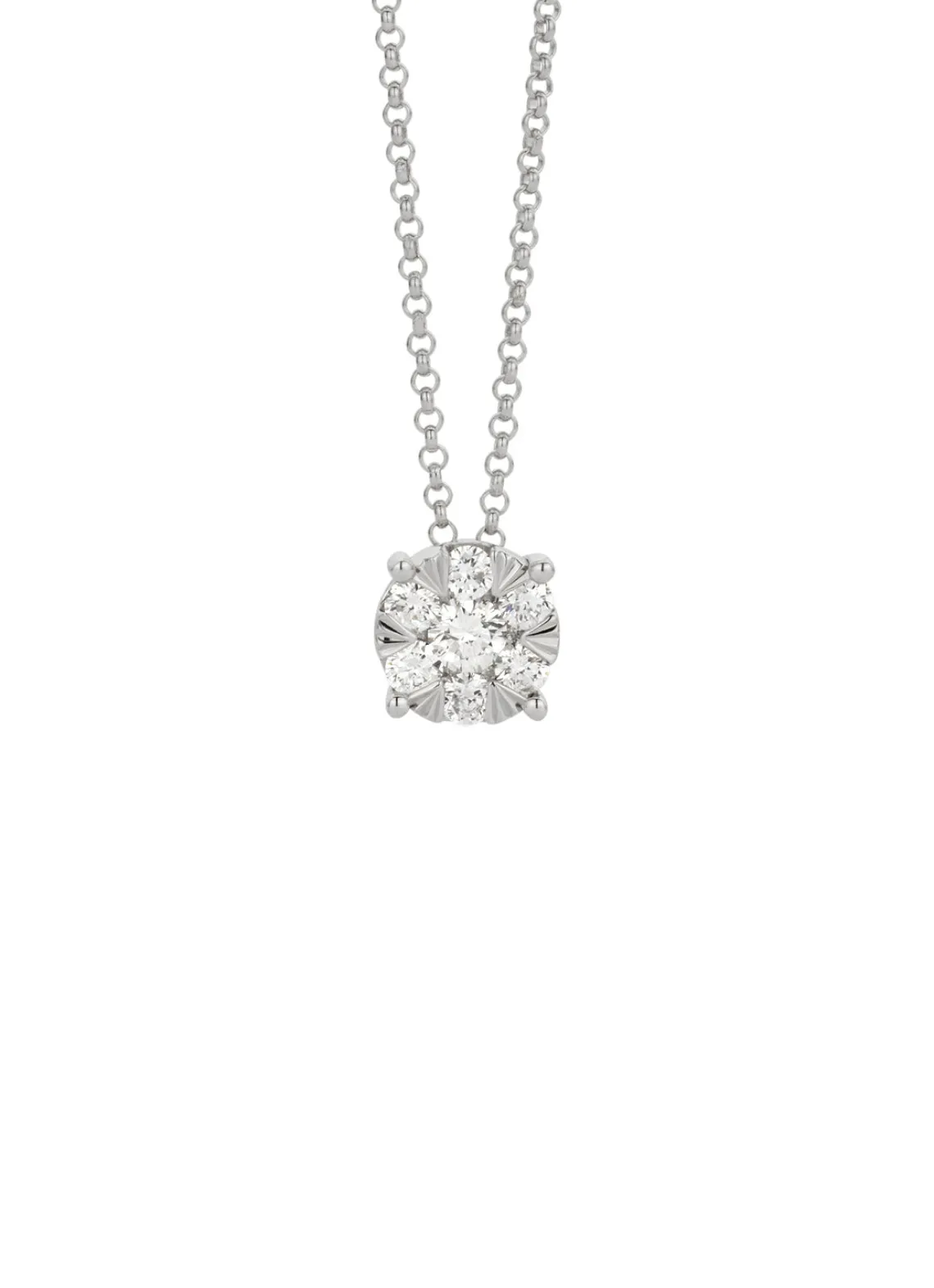 Laat u betoveren door meerdere diamanten in een bijzondere zetting, die samen één schitterend geheel vormen. Door een innovatieve zet-techniek van onze goudsmeden, worden diamanten in drie lagen gezet, waarbij twee lagen aan de binnenkant zijn gekanteld. Dit zorgt voor een optimale reflectie en creëert een verschijning van één enkele diamant met een groter formaat. De gelaagde zetting van de hanger heeft hierdoor een uitstraling van een 1.25ct diamant.
