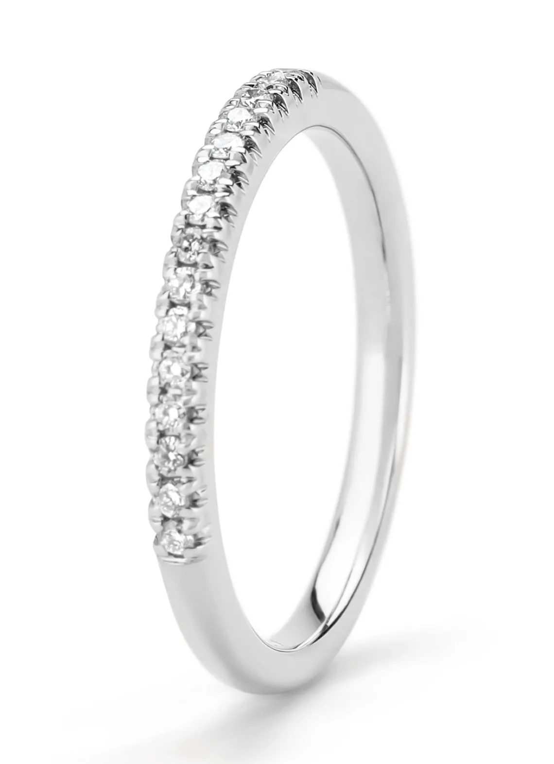 Deze alliance ring van Diamond Point is vervaardigd uit 14 karaat witgoud (2.4 gr.) en is gezet met 15 briljant geslepen diamanten met een totaalgewicht van 0.14 ct. De ring heeft een breedte van 2 mm.