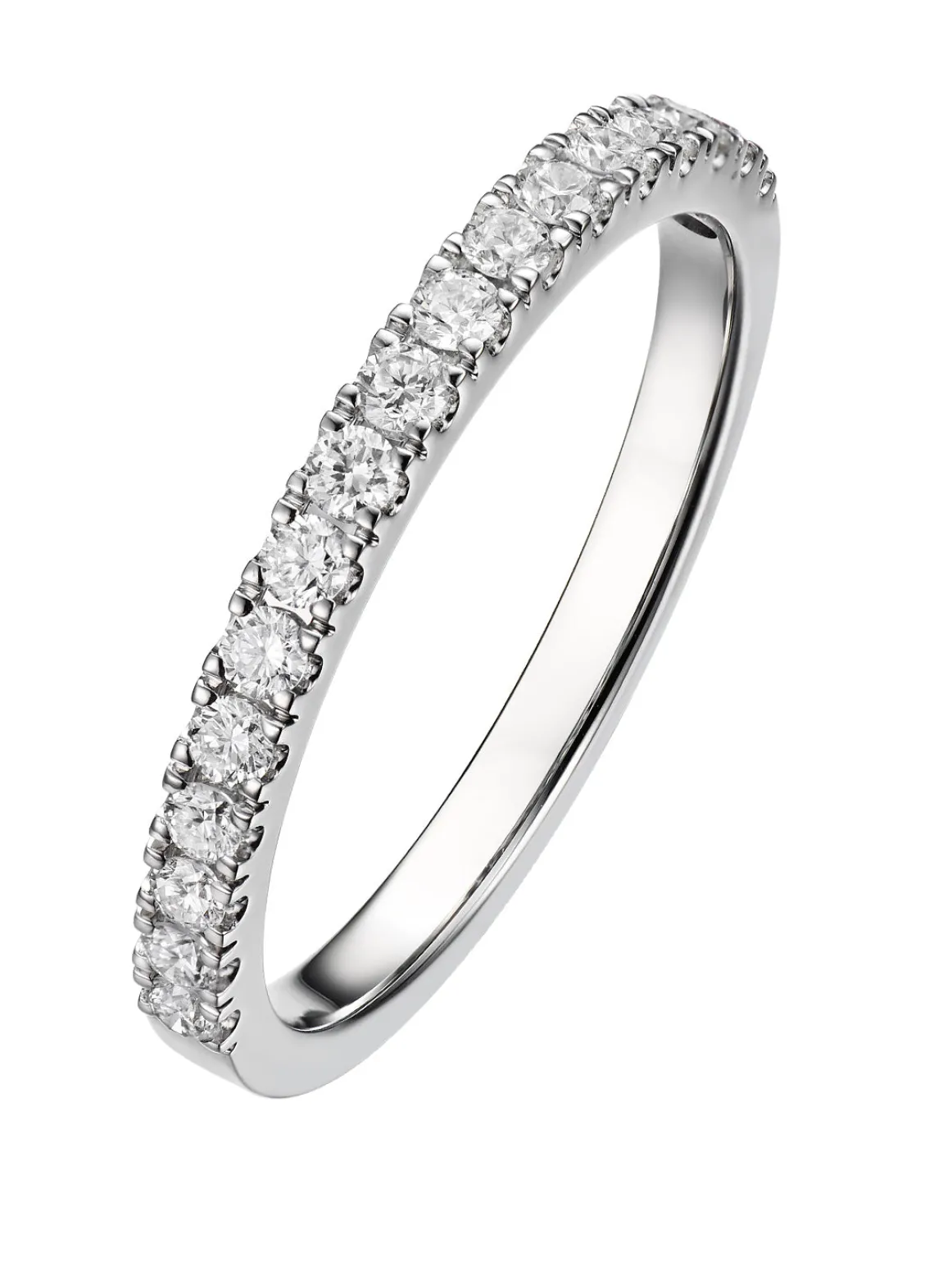 Deze trouwring van Diamond Point is vervaardigd uit 14 karaat witgoud (2.2 gr.) en is gezet met 17 briljant geslepen diamanten met een totaalgewicht van 0.33 ct. De ring heeft een breedte van 2 mm.