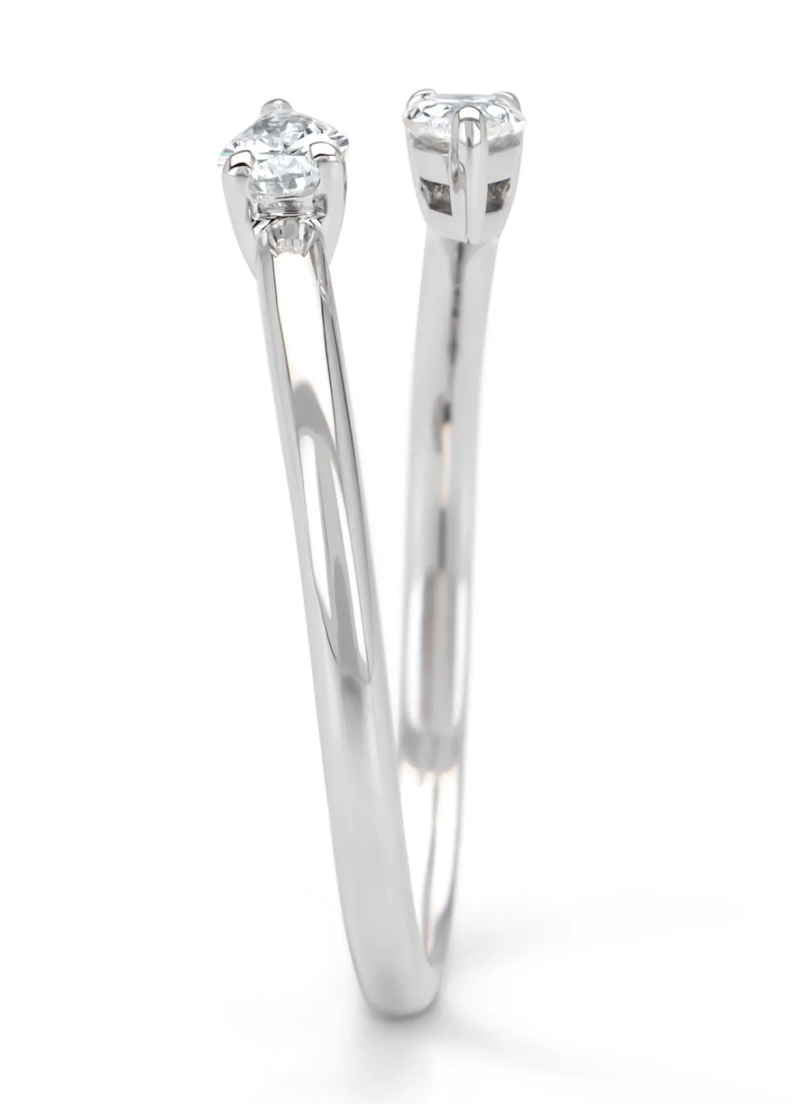 Deze ring van Diamond Point is vervaardigd uit 14 karaat witgoud (1.9 gr.) en is gezet met 2 peer geslepen diamanten met een totaalgewicht van 0.37 ct. De ring heeft een minimale breedte van 1.5 mm., maximale breedte van 3 mm. en een hoogte van 3 mm.