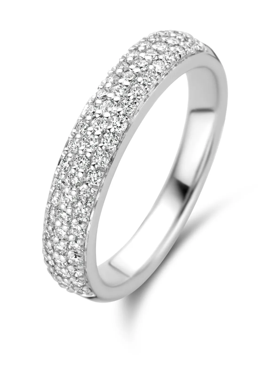 Deze ring van Diamond Point is vervaardigd uit 14 karaat witgoud (3.3 gr.) en is gezet met 59 briljant geslepen diamanten met een totaalgewicht van 0.45 ct. De ring heeft een minimale breedte van 3 mm., maximale breedte van 4 mm. en een hoogte van 3 mm.