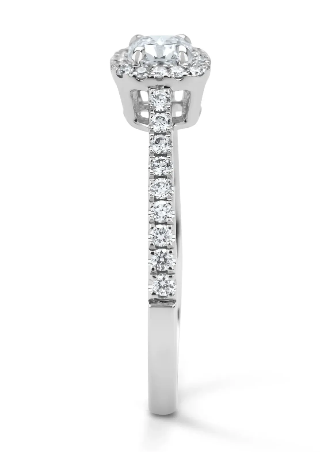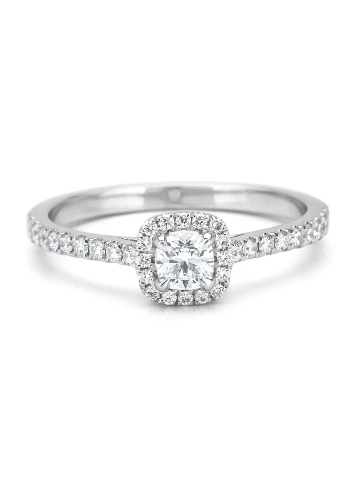 Deze ring van Diamond Point is vervaardigd uit 18 karaat witgoud (2.1 gr.) en is gezet met een cushion (hearts & arrows) en 34 briljant geslepen diamanten met een totaalgewicht van 0.55 ct. De ring heeft een diameter lang van 1.8 mm., maximale breedte van 6.1 mm. en een hoogte van 5 mm.