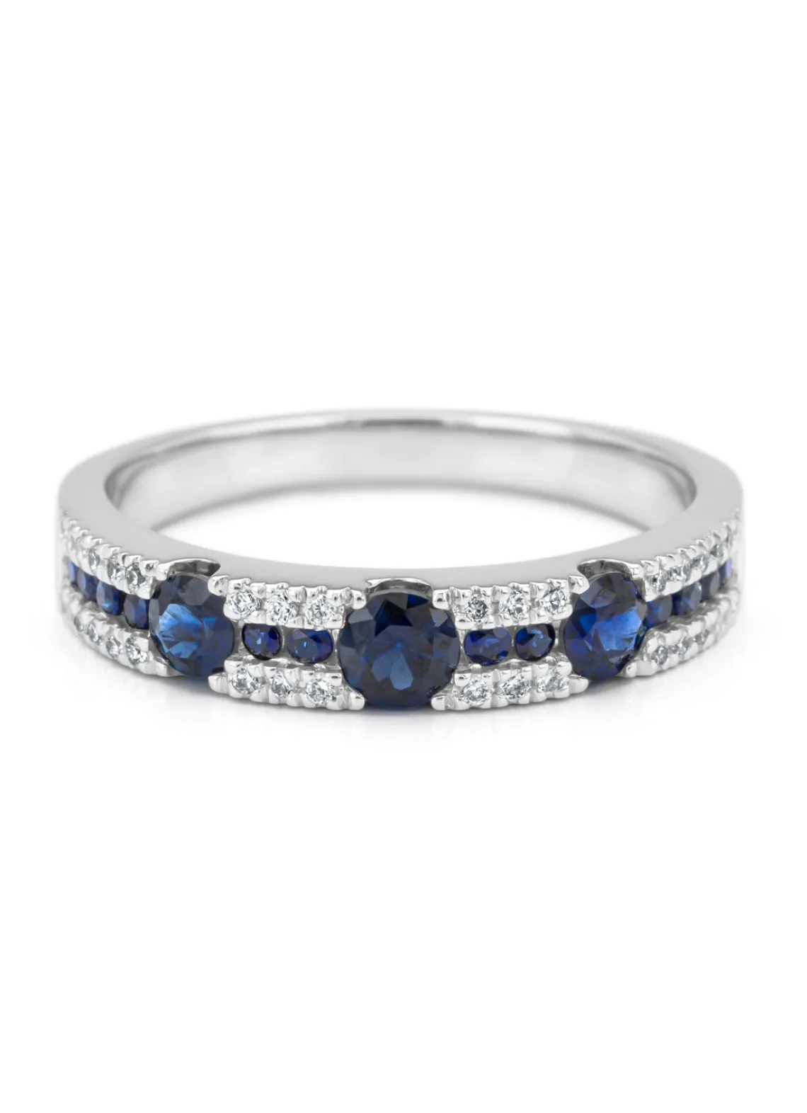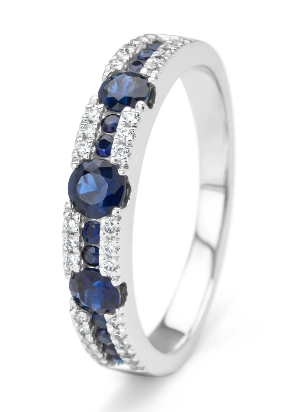 Deze ring gezet met kleurstenen van Diamond Point is vervaardigd uit 14 karaat witgoud (3.2 gr.) en is gezet met 15 blauwe saffieren en 36 briljant geslepen diamanten met een totaalgewicht van 0.11 ct. De ring heeft een minimale breedte van 2 mm., maximale breedte van 3.5 mm. en een hoogte van 3 mm.