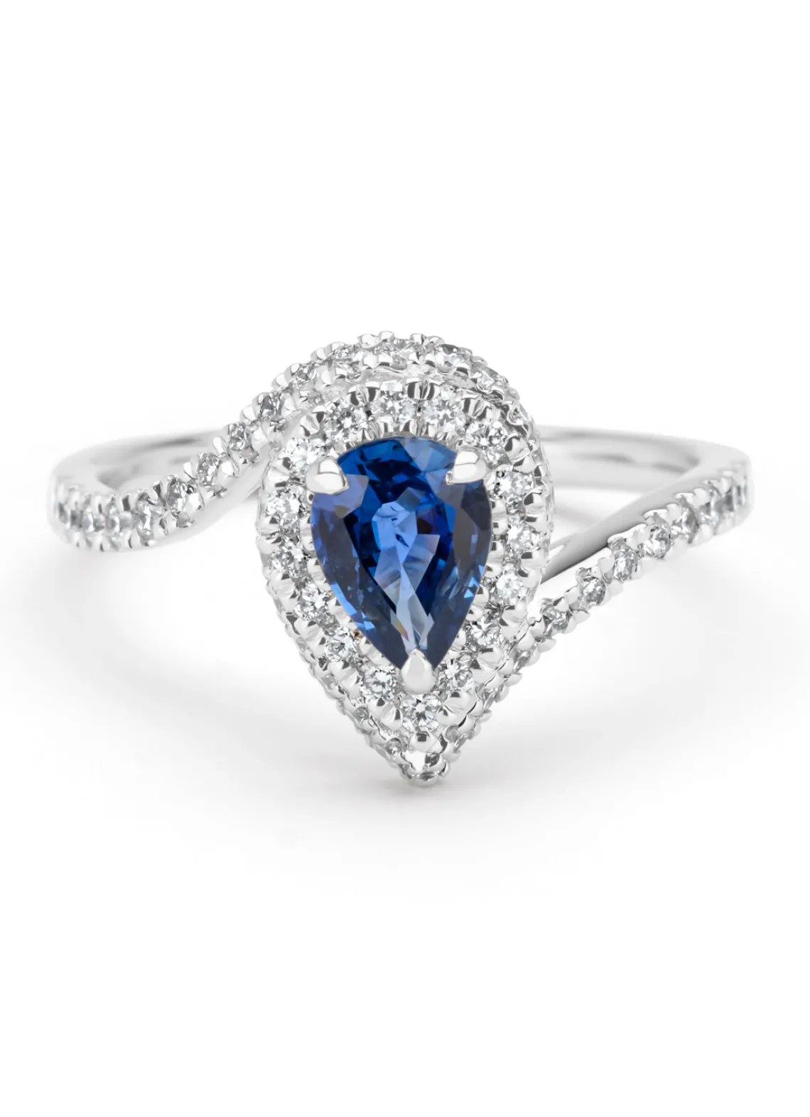 Deze ring gezet met kleurstenen van Diamond Point is vervaardigd uit 14 karaat witgoud (2.8 gr.) en is gezet met een peer blauwe saffier en 54 briljant geslepen diamanten met een totaalgewicht van 0.44 ct. De ring heeft een minimale breedte van 1.9 mm., maximale breedte van 13 mm. en een hoogte van 6 mm.