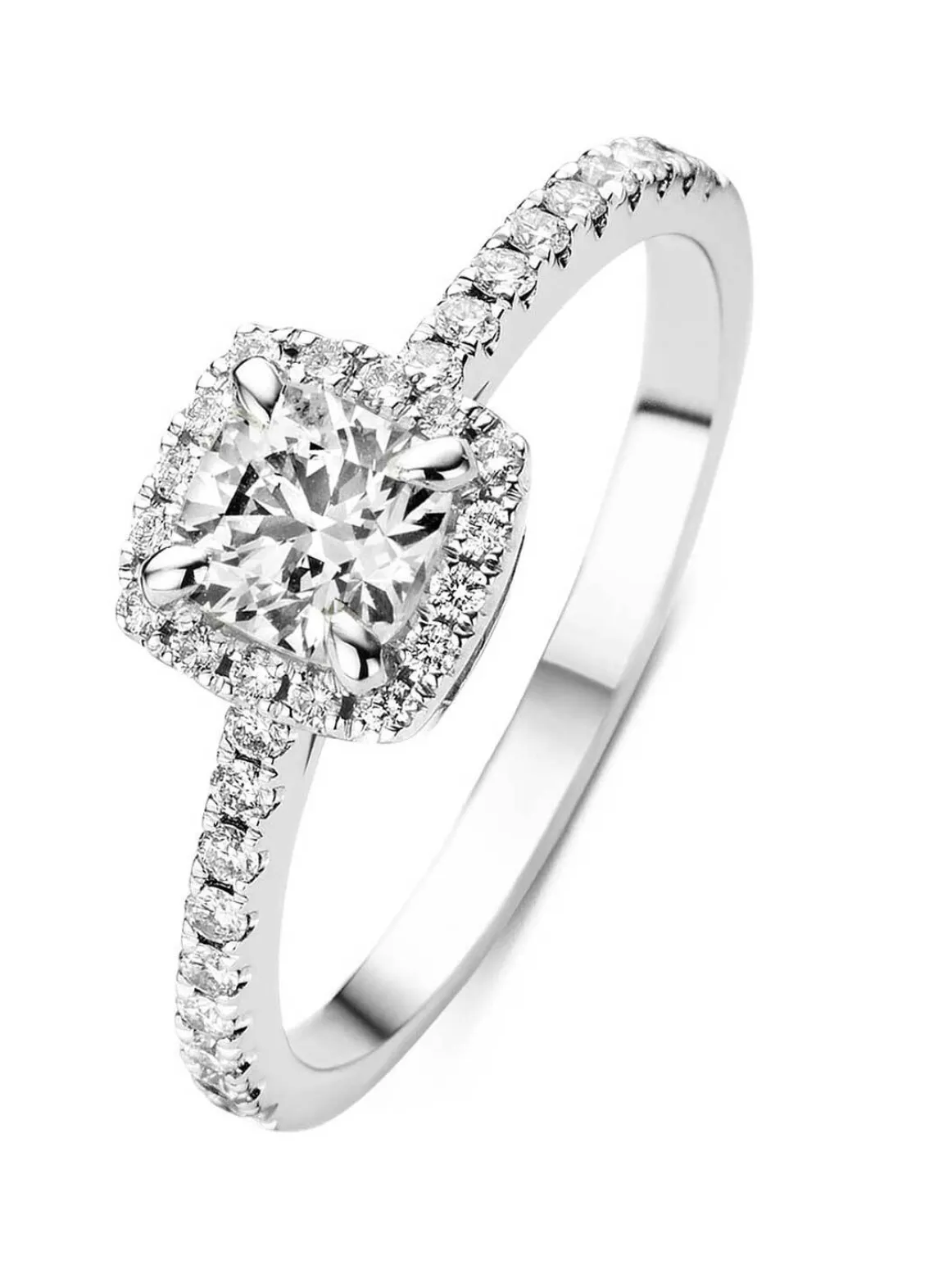 Deze solitair ring van Diamond Point is vervaardigd uit 18 karaat witgoud (2.7 gr.) en is gezet met een cushion (hearts & arrows) en 34 briljant geslepen diamanten met een totaalgewicht van 0.89 ct. De ring heeft een breedte van 7.5 mm. en een hoogte van 5.5 mm.