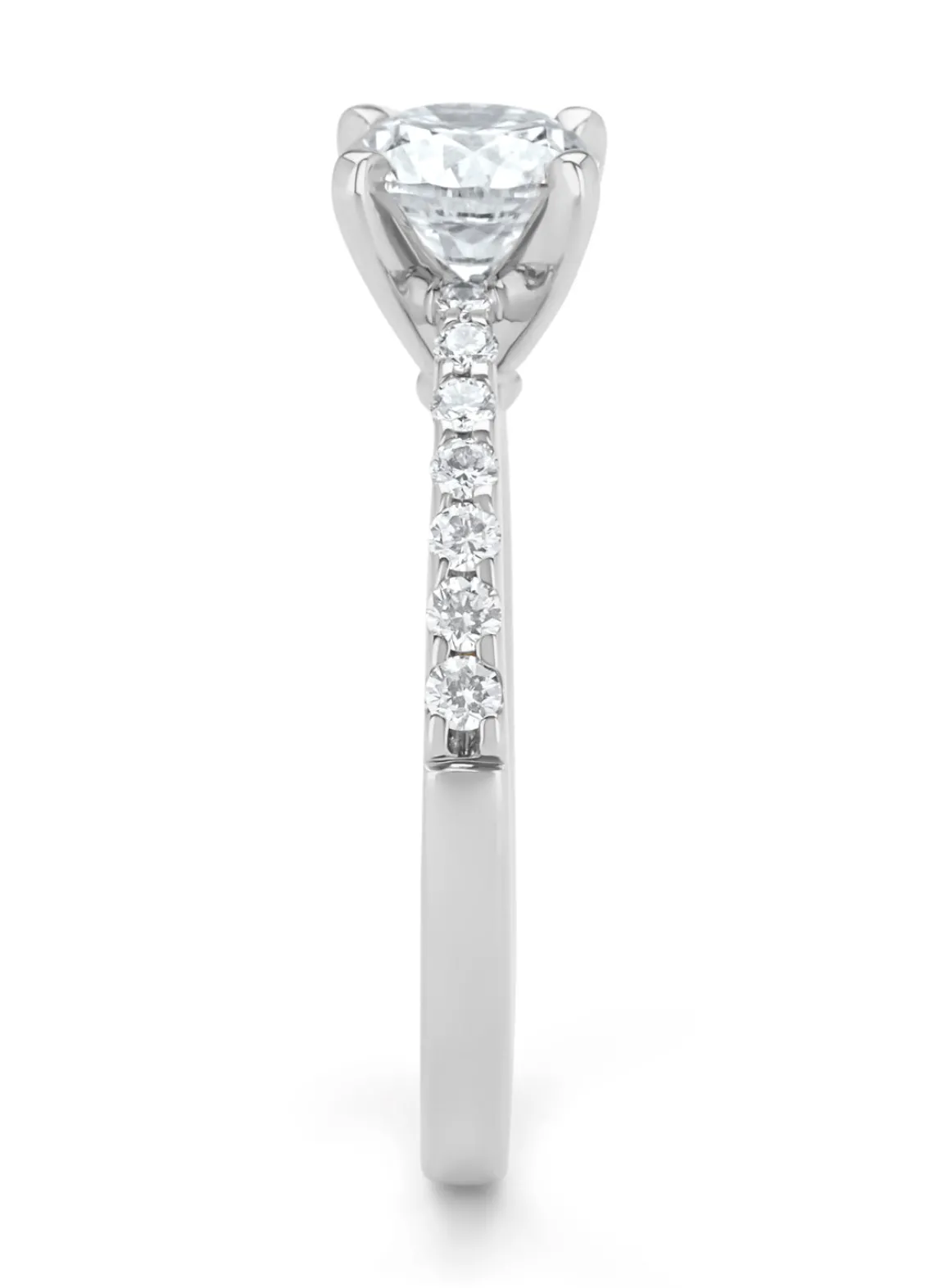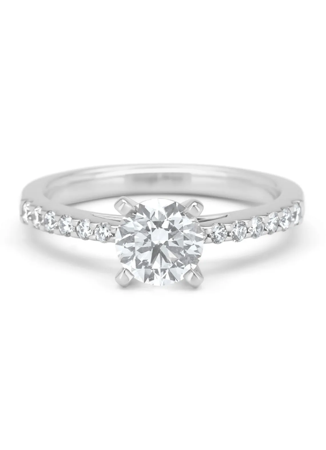 Deze solitair ring van Diamond Point is vervaardigd uit 18 karaat witgoud (3.6 gr.) en is gezet met 15 briljant geslepen diamanten met een totaalgewicht van 1.25 ct. De ring heeft een diameter van 6.4 mm., minimale breedte van 2.1 mm. en een hoogte van 7 mm.